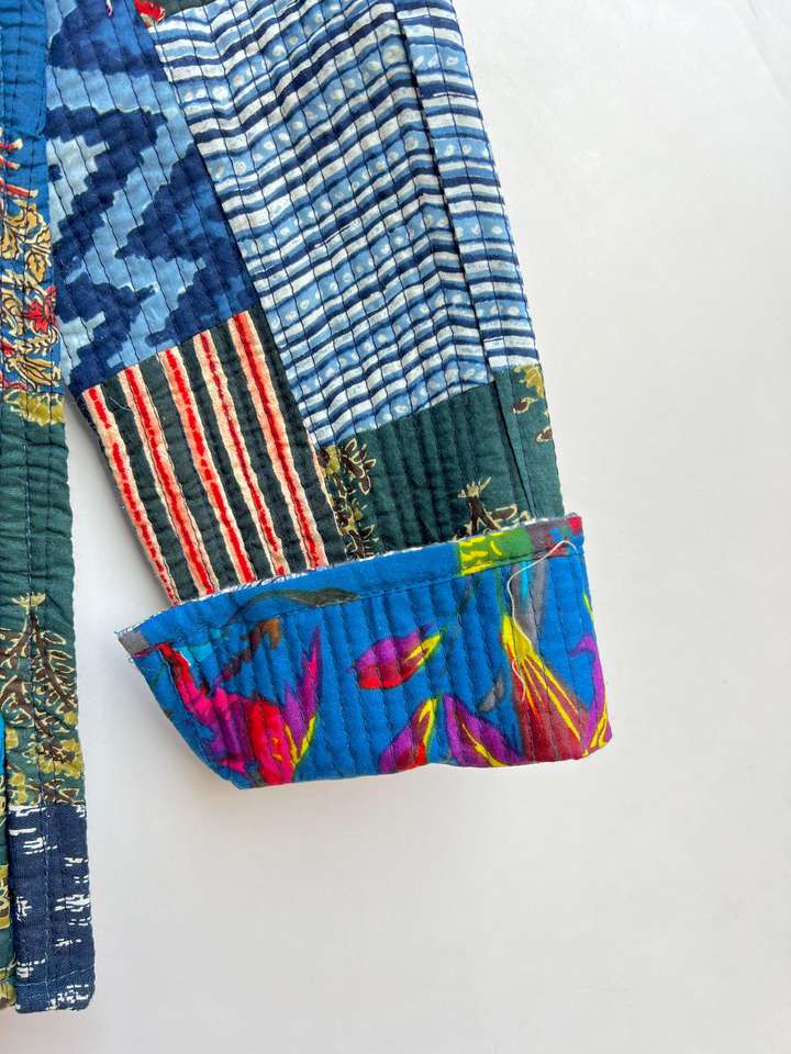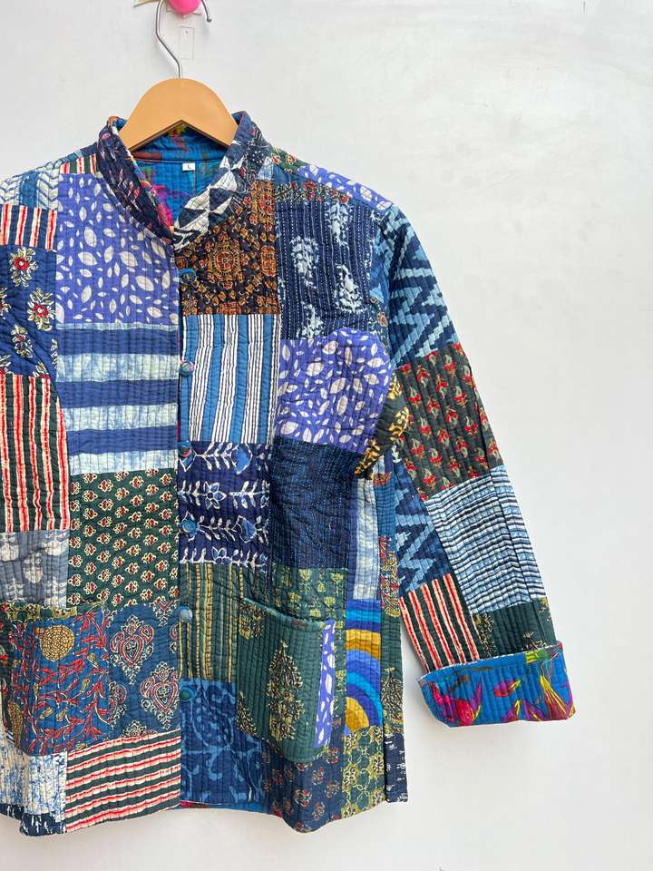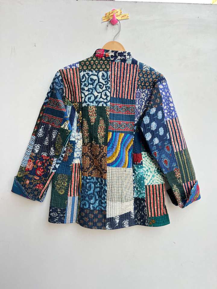 เสื้อโค้ทเย็บมือถักคอวีปิดกระดุมสองแถวงานเย็บปะสั้นของผู้หญิงเสื้อโค้ทเย็บมือสไตล์วินเทจทำด้วยมือ