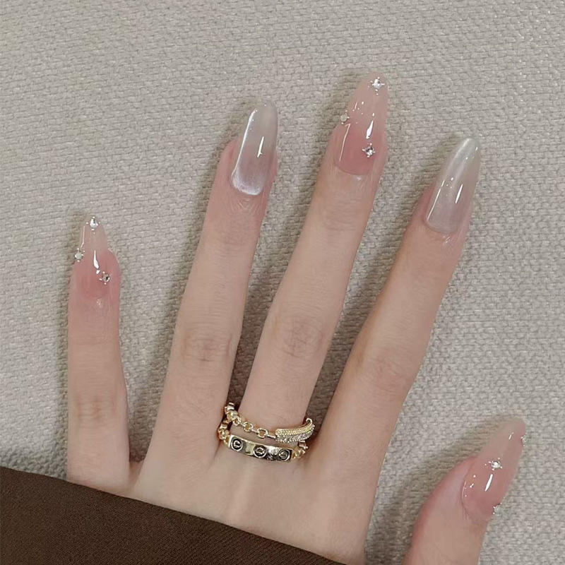 เล็บที่สวมใส่ได้ทำด้วยมือปลายเล็บสีชมพูเปลือยไล่ระดับสีบดขนาดกลางรูปไข่หรูหราปลายเล็บที่ทำไว้ล่วงหน้า