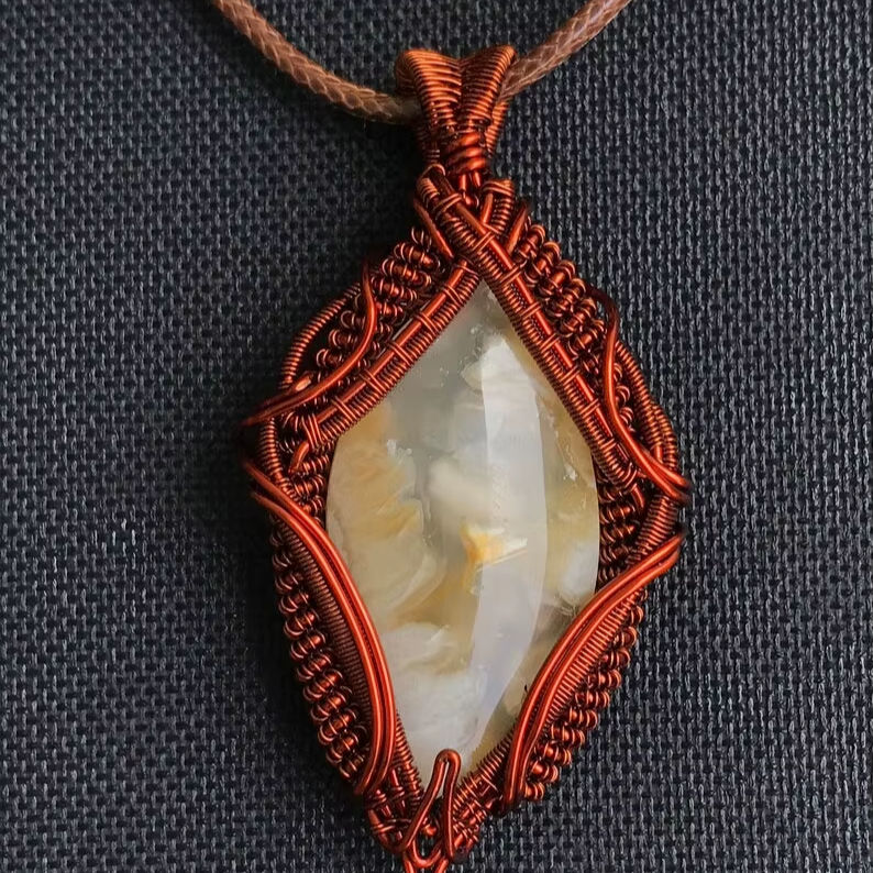 จี้หินสีขาวทำมือ หุ้มลวดทองแดงโบราณ ชุบทอง 18K เครื่องประดับงานฝีมือสุดหรูสำหรับงานหมั้น งานแต่งงาน และงานเลี้ยง