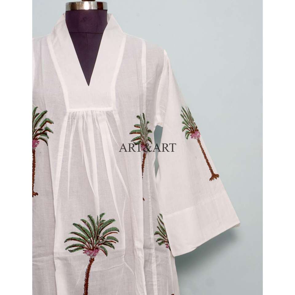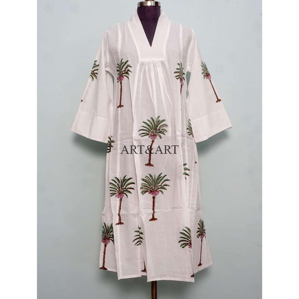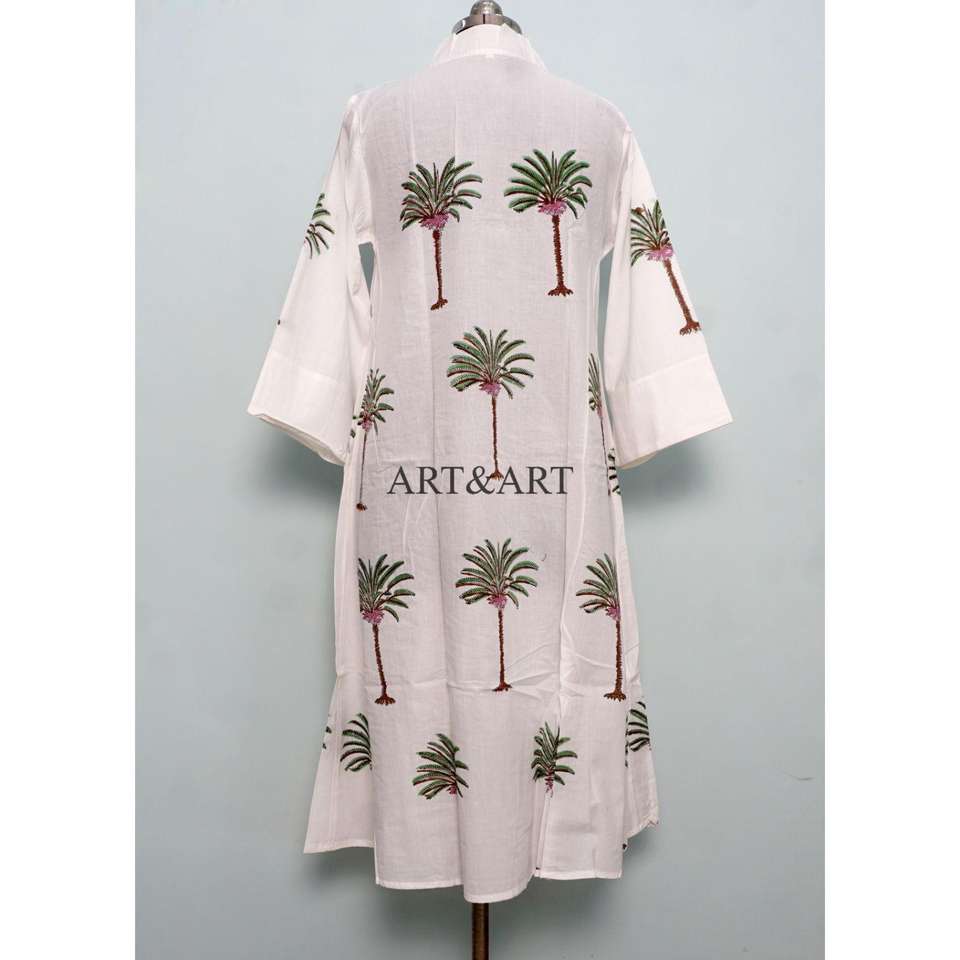 Handmade White Cotton Midi Dress for Women Boho Style with Loose Fit Eco-Friendly Hand Block Print Casual Vacation T Shirt