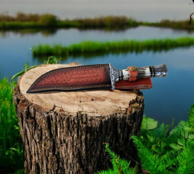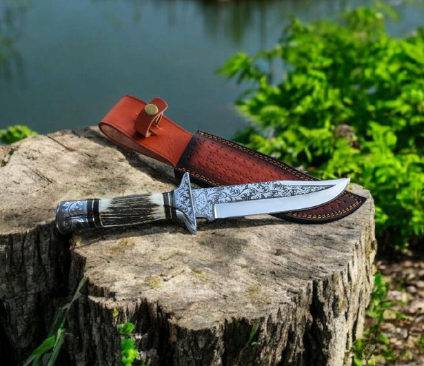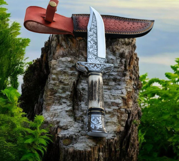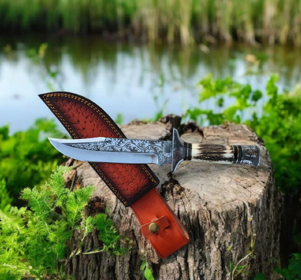 มีดล่าสัตว์เหล็กกล้าคาร์บอนสลักลาย ด้ามไม้กวาง ปลอกหนัง ปลอดภัยสำหรับเครื่องล้างจาน ดีไซน์ทันสมัย ผลิตด้วยมือ ขายส่ง
