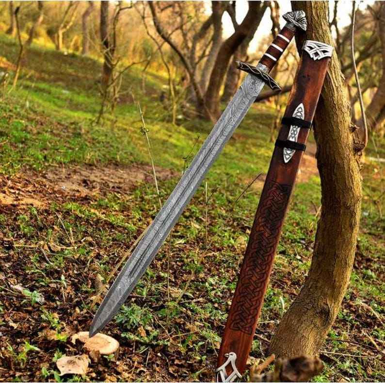 ดาบไวกิ้งเหล็กดามัสกัสพรีเมียมทำมือขายส่ง คุณภาพสูง สำหรับตั้งแคมป์กลางแจ้ง เอาตัวรอด ล่าสัตว์ พร้อมปลอกหนัง