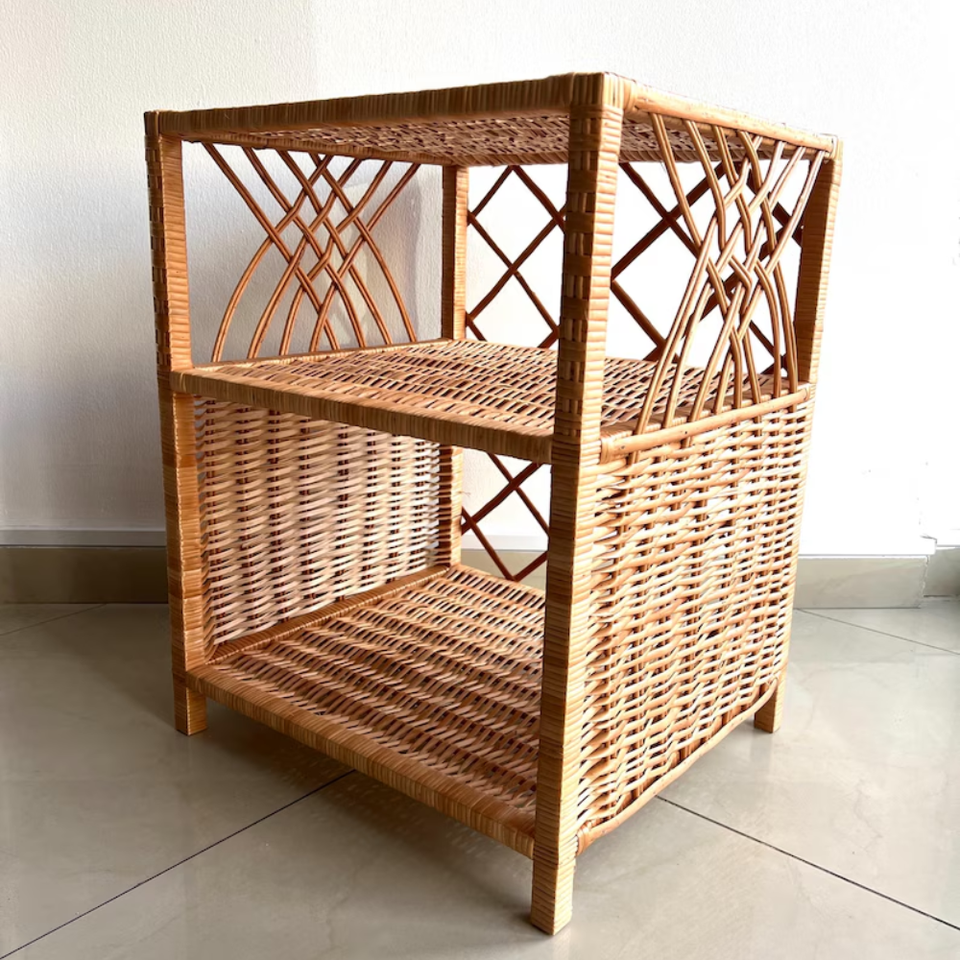 โต๊ะข้างเตียงหวายทำมือ สไตล์โบโฮ ชั้นวางของข้างเตียง