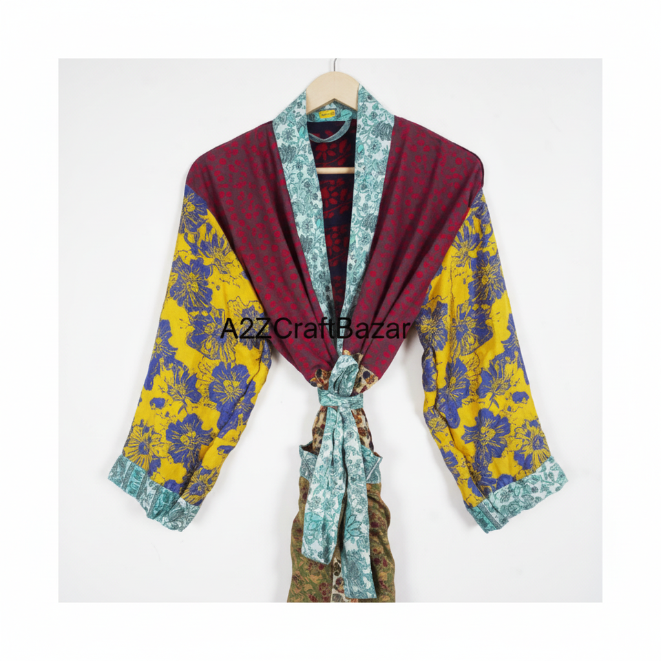 ชุดคลุมกิโมโนผ้าไหมยาวสำหรับผู้หญิง งานแฮนด์เมด คอวี ผูกเชือก ปิดด้วยเชือกผูก ความยาวเต็มตัว ดีไซน์แบบปะติดปะต่อ เหมาะสำหรับฤดูหนาว ไซส์เดียว สำหรับเพื่อนเจ้าสาว
