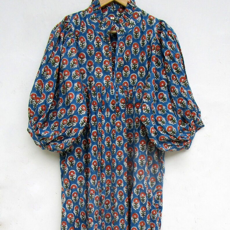 ชุดแม็กซี่เดรสคอวีแขนยาวปักลายดอกไม้สไตล์โบฮีเมียนลำลองมีกระดุมธรรมชาติฤดูใบไม้ผลิฤดูใบไม้ร่วงทำด้วยมือ