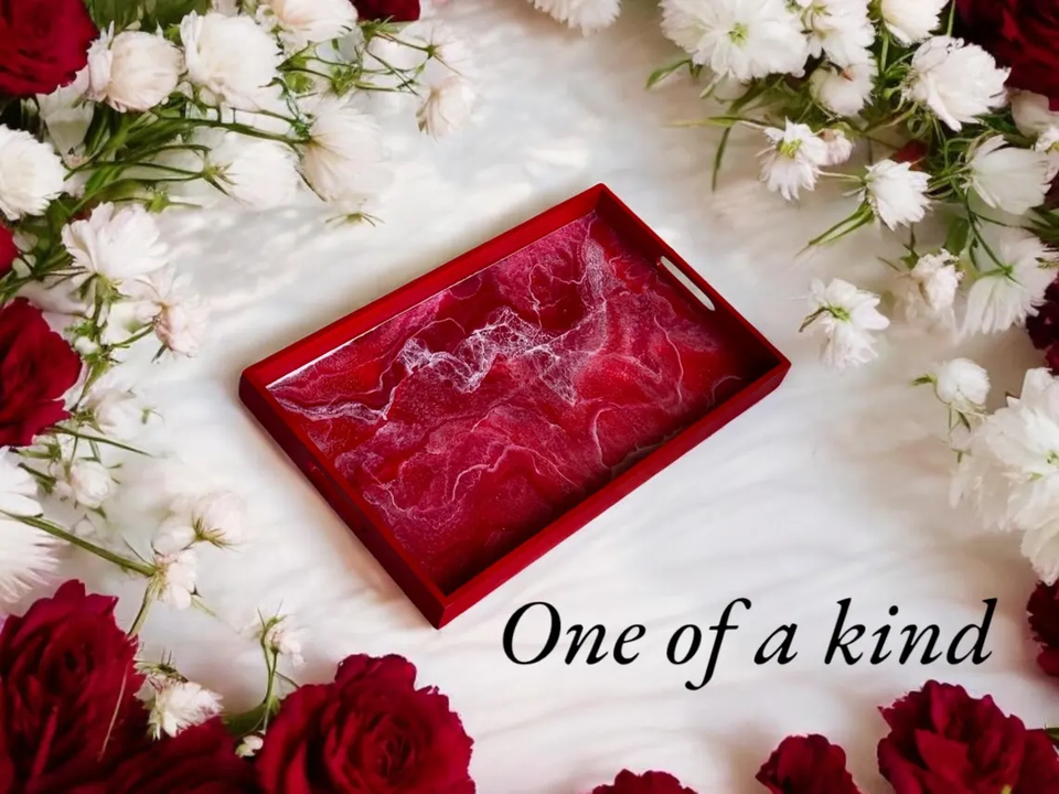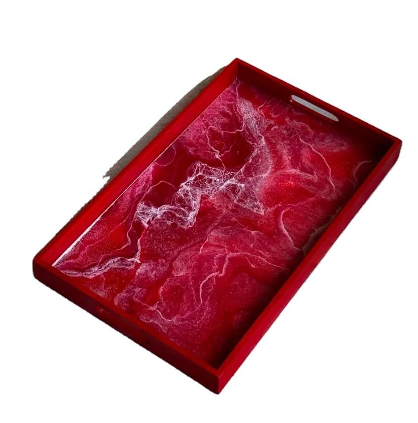 ถาดไม้อีพ็อกซี่ทำด้วยมือมีดีไซน์สีแดงเป็นมิตรกับสิ่งแวดล้อมถาดให้บริการหรือทีวีพร้อมที่จับสำหรับตกแต่ง