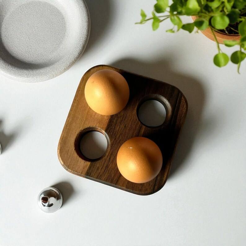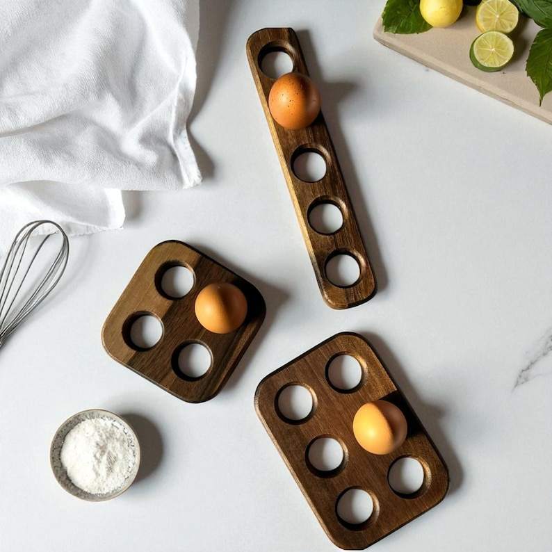 ชั้นวางไข่ไม้ทำมือพร้อมพื้นผิวแบบออร์แกนิกและดีไซน์ใช้งานได้จริงเพื่อการจัดเก็บไข่อย่างเป็นระเบียบบนเคาน์เตอร์ครัว