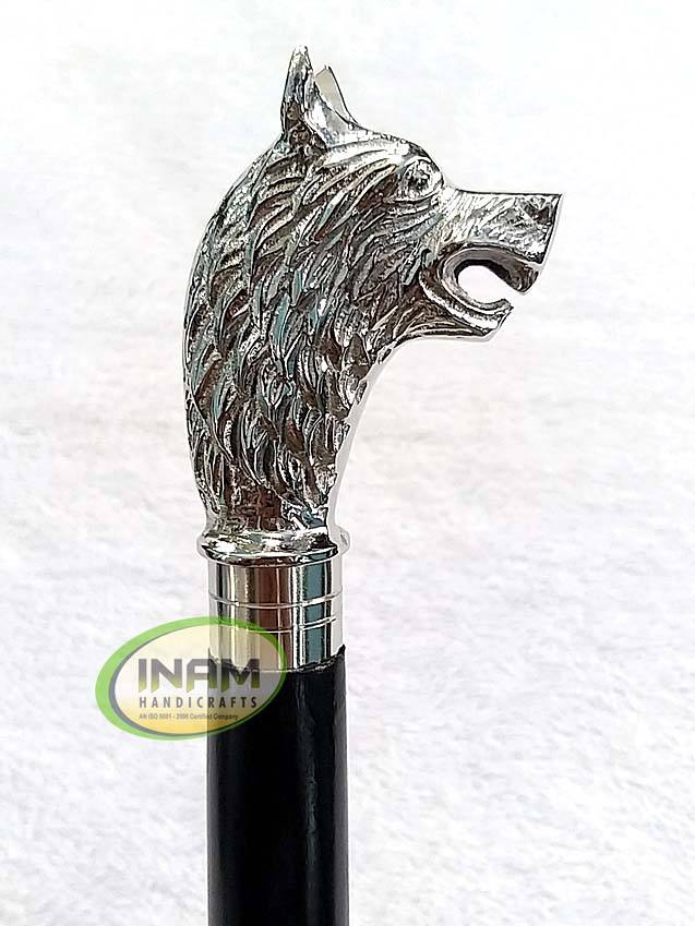 ไม้เดินมือจับทำด้วยมือพร้อมด้ามหมาป่าสีเงินดีไซน์เนอร์,ไม้เท้าไม้พร้อมที่จับหมาป่าทองเหลือง