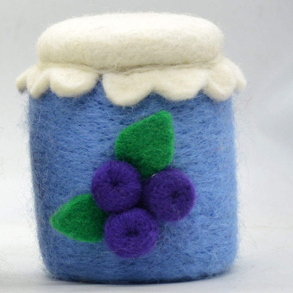 Handmade Wool Felt Blueberry Jam Jar with Realistic Blueberries on Front - Eco-Friendly Soft Wool Felt Craft