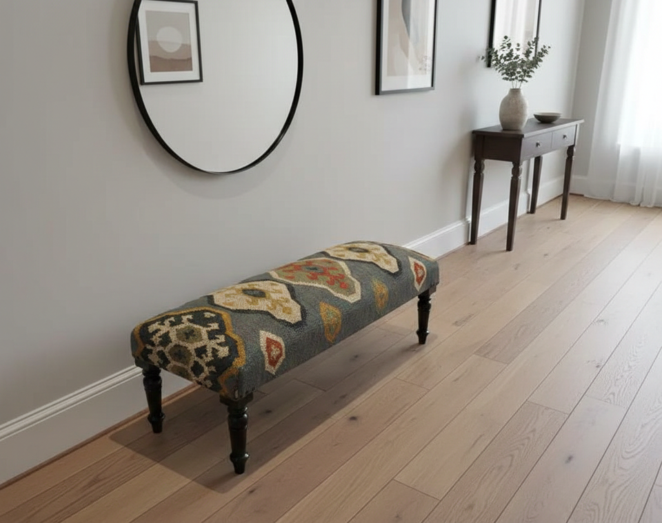 ม้านั่งคิลิมทำมือแบบดั้งเดิมพร้อมขาไม้เนื้อแข็ง | ม้านั่งออตโตมันหุ้มเบาะสำหรับใช้ในห้องโถงและห้องนอน