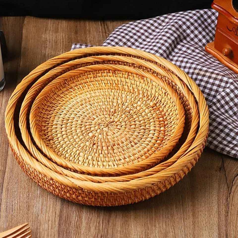 Handmade Woven Bamboo Food Storage Weaving Tray Organizer Round Wicker Flat Shallow Home & GardenDecorative Fruit Rattan Basket