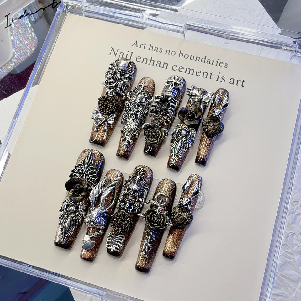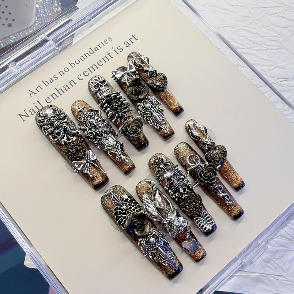 เล็บปลอมแบบสวมครึ่งเล็บทรงอัลมอนด์ ทำมือ ลายไล่สีแคทอายเรซิ่น หรูหรา ยาว สีดำเข้ม สไตล์ยุโรปอเมริกัน