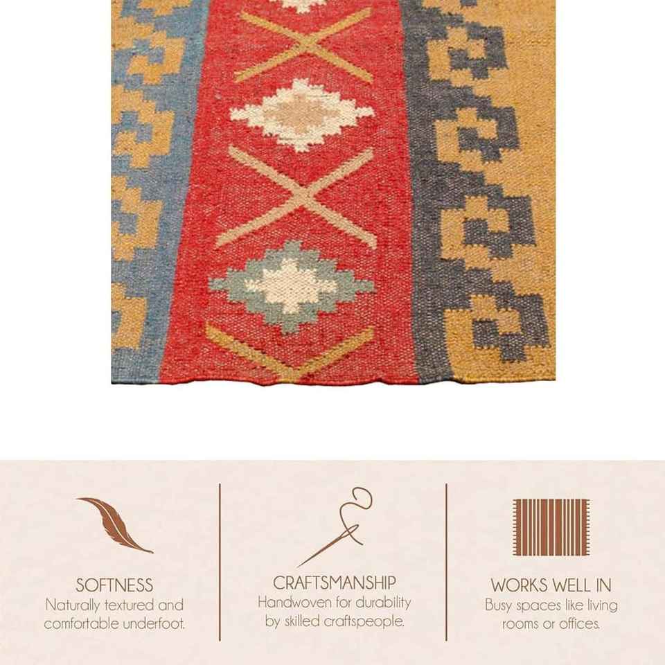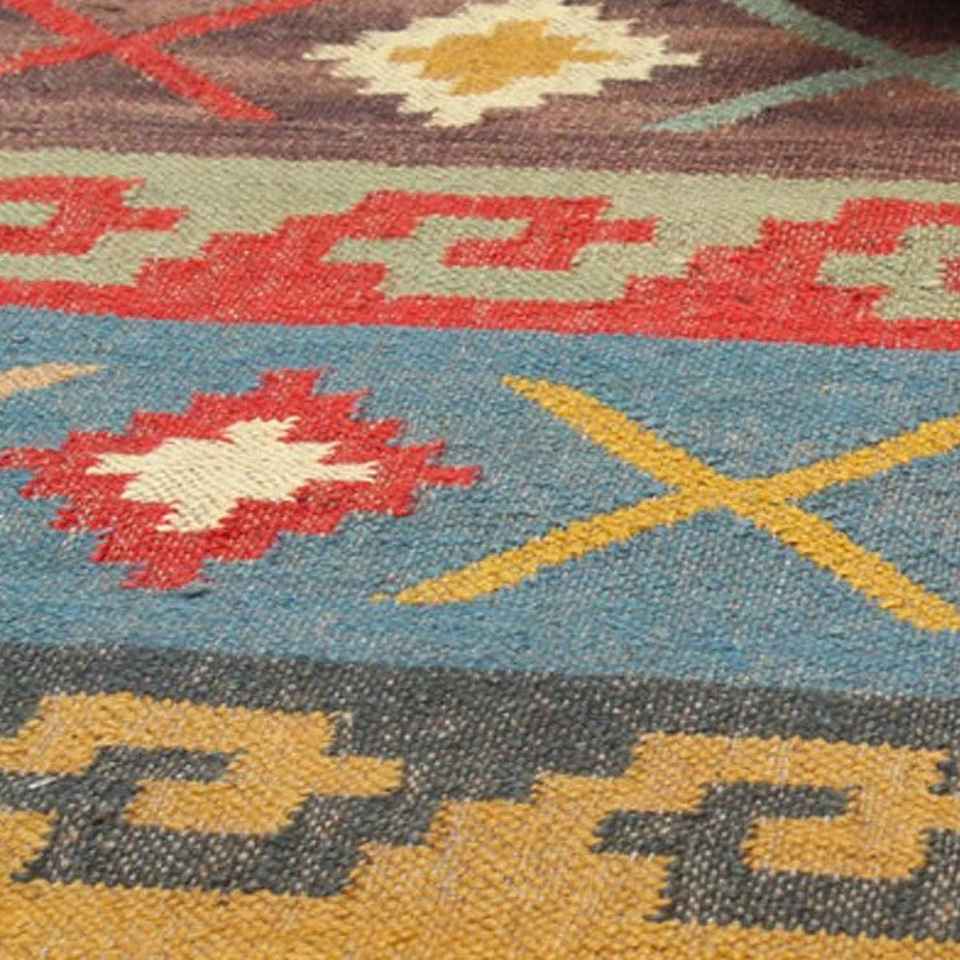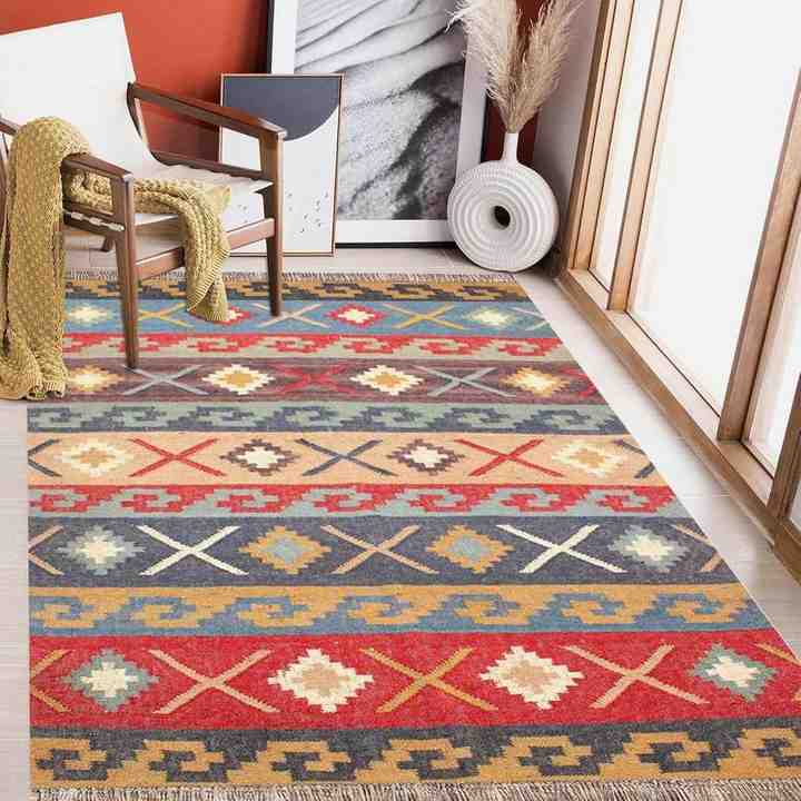 พรมคิลิมทำมือจากปอกระเจาและขนสัตว์ เป็นมิตรกับสิ่งแวดล้อม ปรับแต่งได้ เหมาะสำหรับห้องนั่งเล่น ห้องนอน และห้องทำงาน