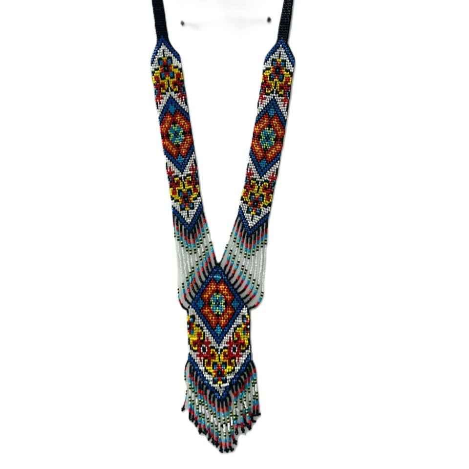 สร้อยคอประดับลูกปัดทำมือ ลวดลายดอกไม้และรูปทรงเรขาคณิตสีสันสดใส สวมใส่โดยผู้หญิงที่สง่างาม สะท้อนความงดงามทางวัฒนธรรม