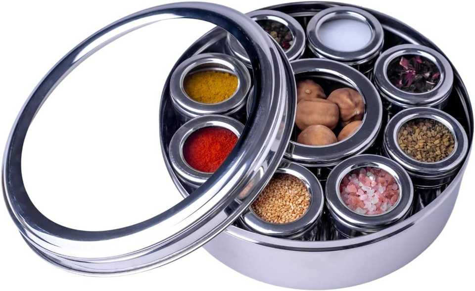 ภาชนะเครื่องเทศโลหะทำด้วยมือพร้อมฝาปิดกล่องมาซาลาและที่เก็บเครื่องปรุงอาหารจำนวนมาก