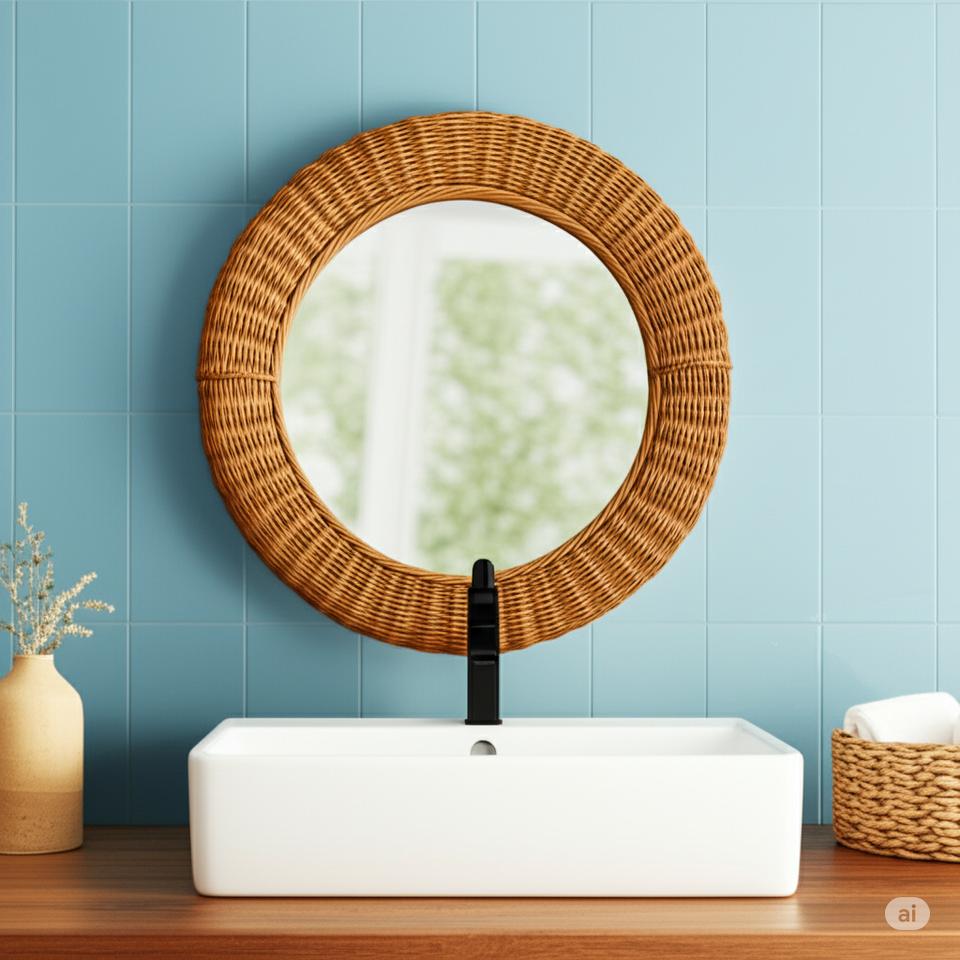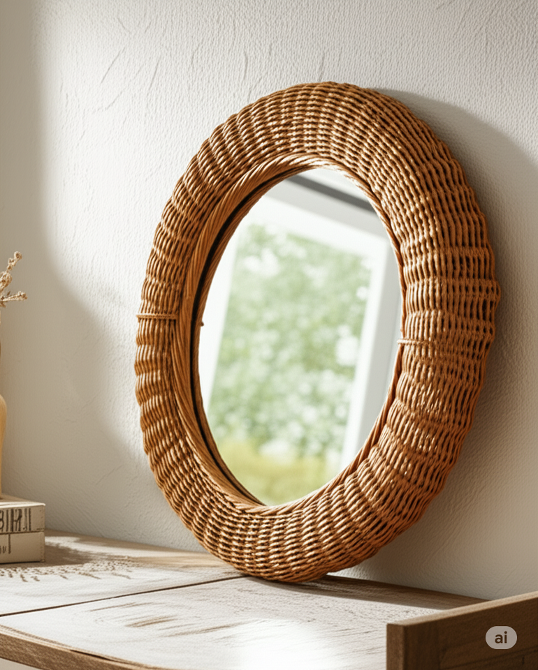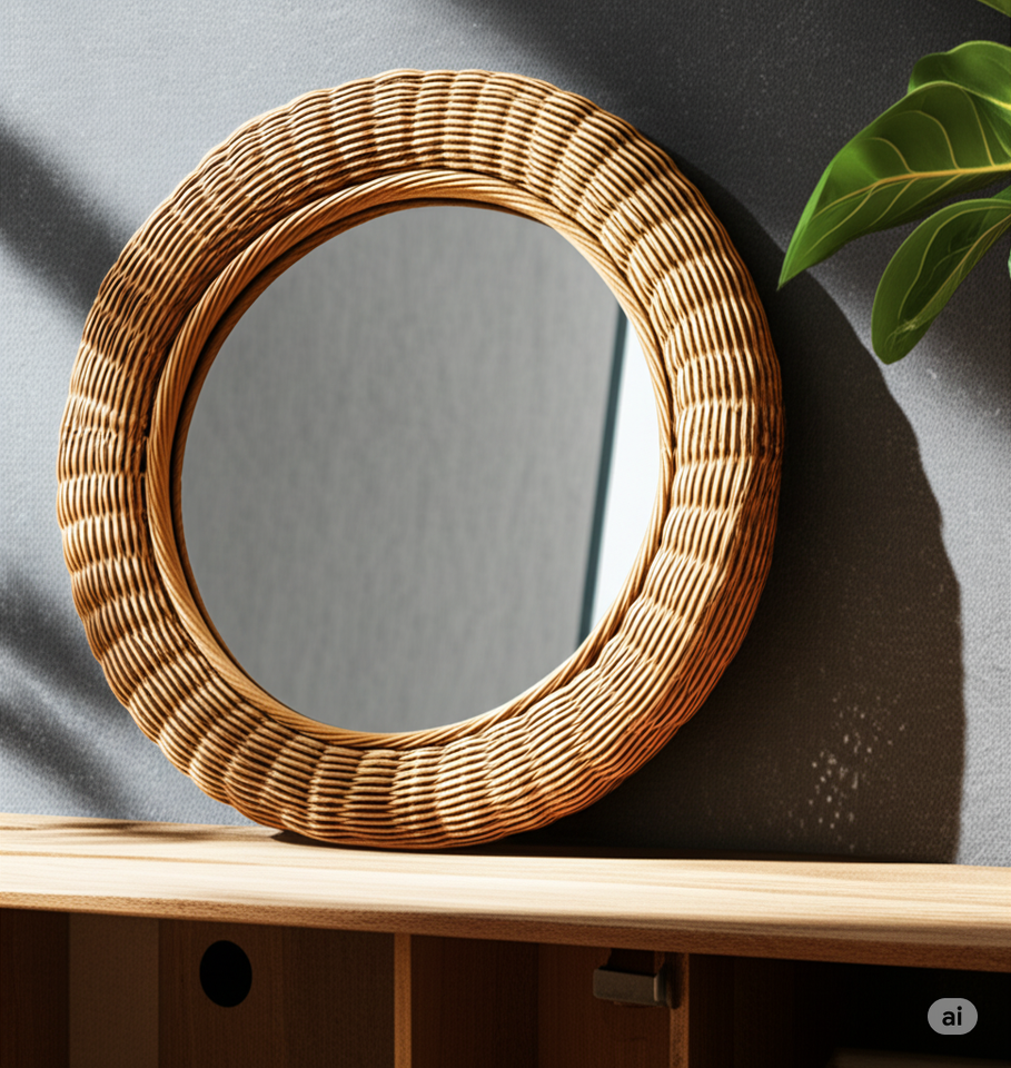 กระจกติดผนังหวายทำด้วยมือกระจกตกแต่งสไตล์โบโฮธรรมชาติสำหรับห้องนั่งเล่นห้องนอนทางเข้าบ้านที่เป็นมิตรต่อสิ่งแวดล้อม