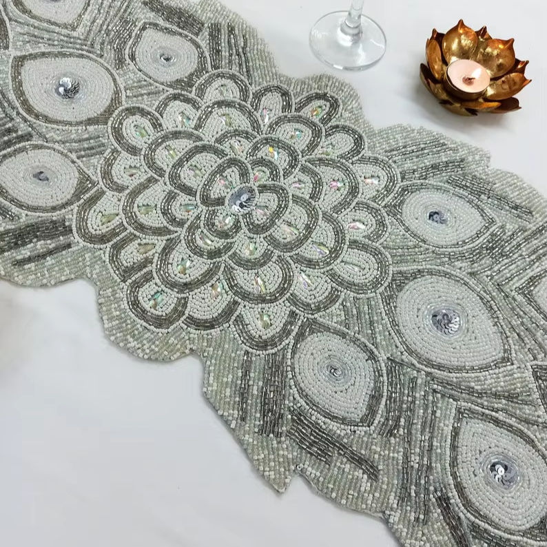 ผ้าปูโต๊ะประดับลูกปัดลายขนนกยูงสีเงินทำมือ