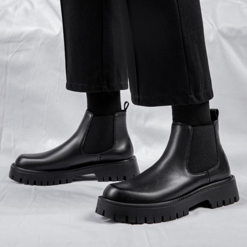 รองเท้าบูทเชลซีหนัง PU ทรงหล่อเท่ สวมใส่สบาย เพิ่มความสูง พื้นหนา รองเท้าหนังแบบสวมสำหรับผู้ชาย