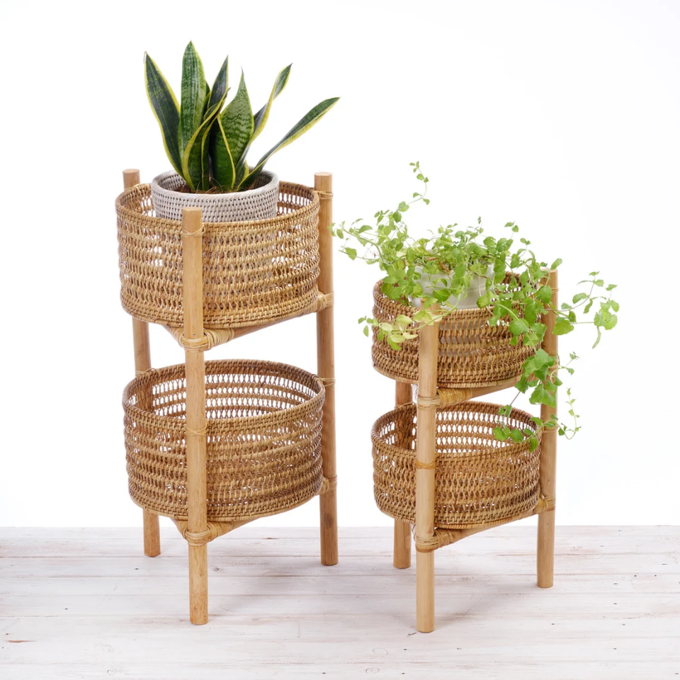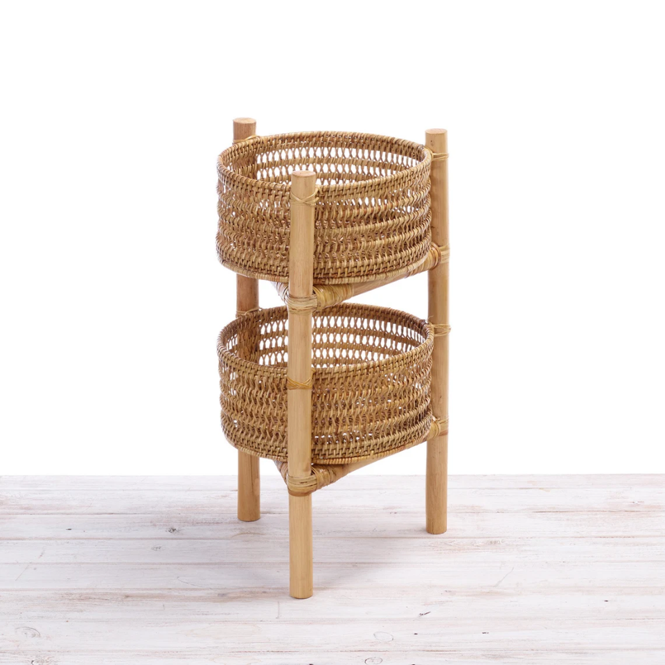 ชั้นวางเสิร์ฟหวาย 2 ชั้น ทอมือ / ถาดโชว์ผลไม้และคัพเค้กทรงกลม พร้อมโครงไม้ไผ่