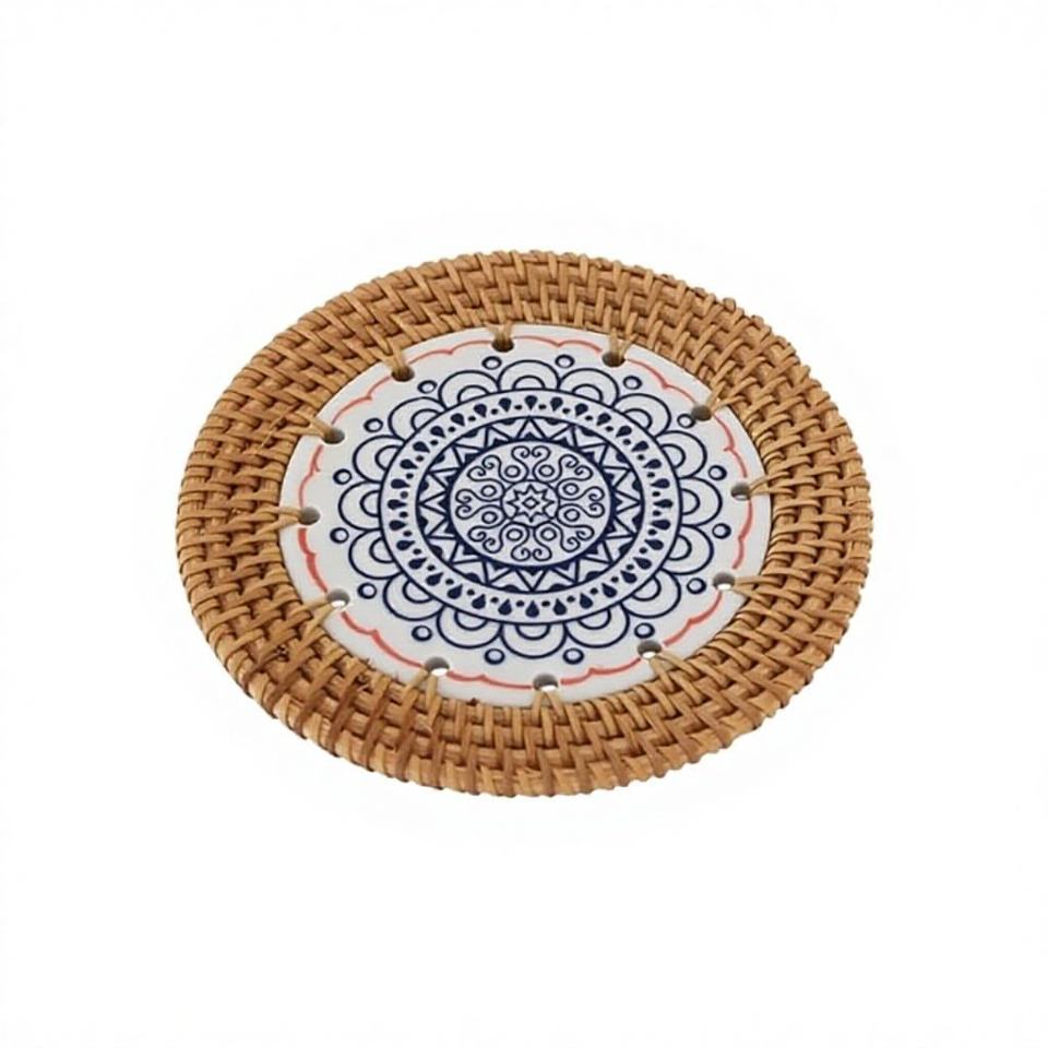 แผ่นรองแก้วหวายธรรมชาติสไตล์โบฮีเมียนทอมือโดยช่างฝีมือชาวเวียดนาม สำหรับกาแฟ ชา และใช้ในบ้านทุกวัน