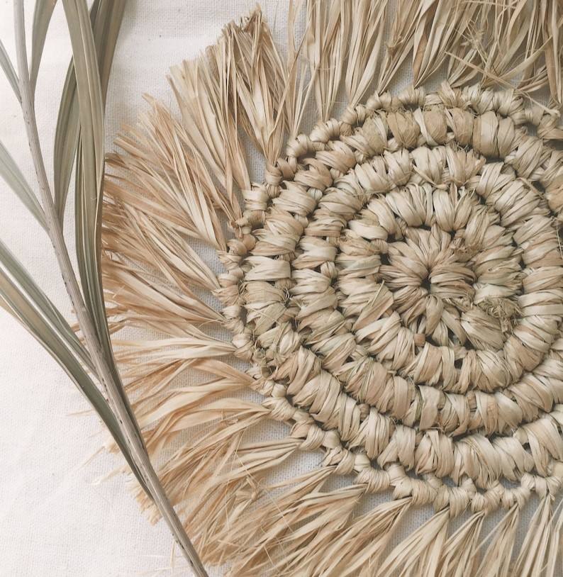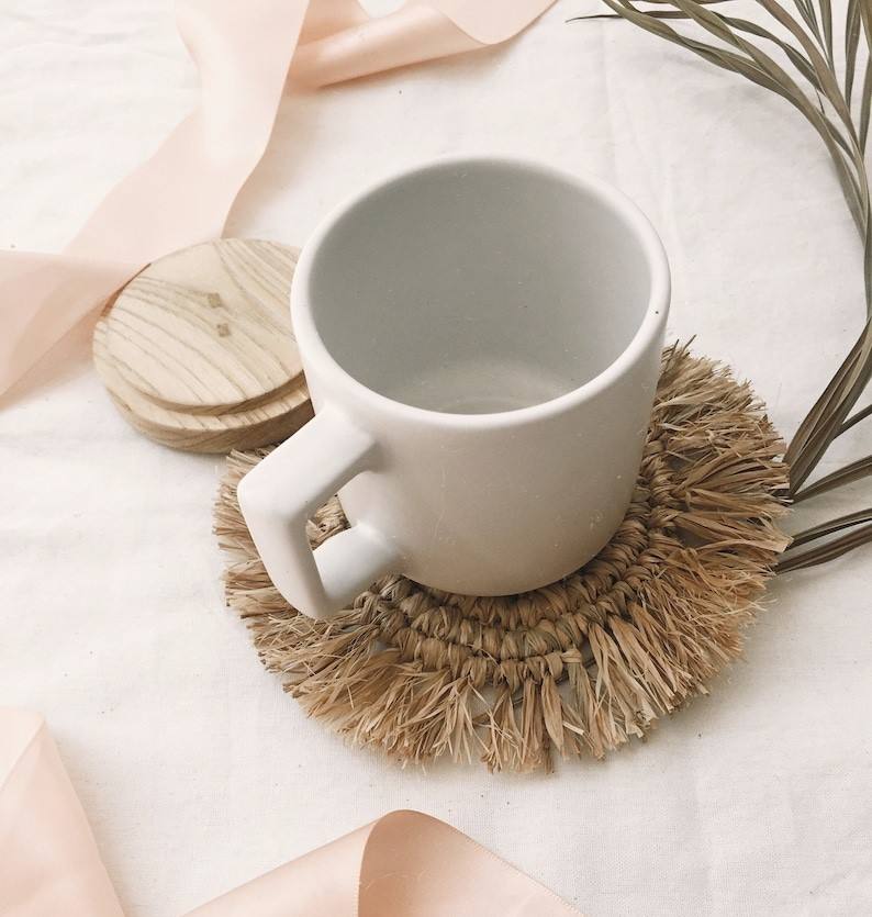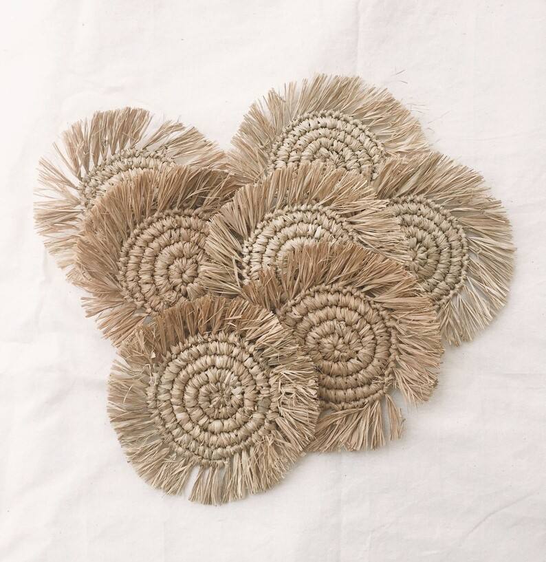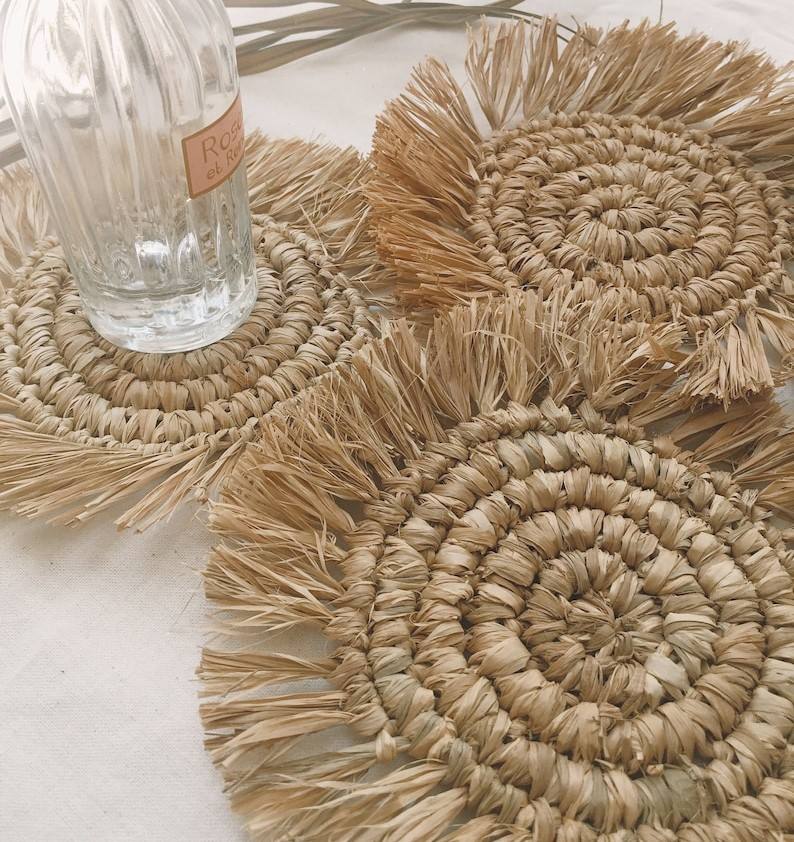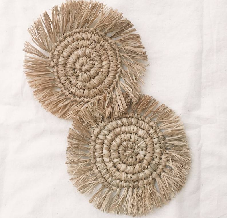 จานรองแก้วทรงกลมเปลือกข้าวโพดแบบทอมือพร้อมขอบแผ่นรองจาน Boho Raffia และที่รองแก้ว