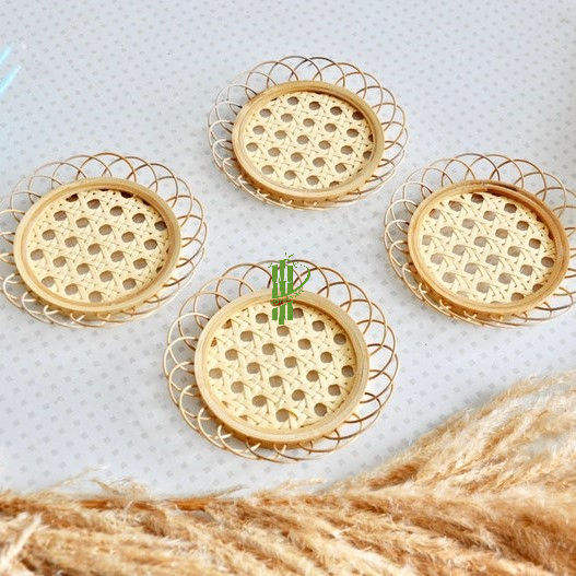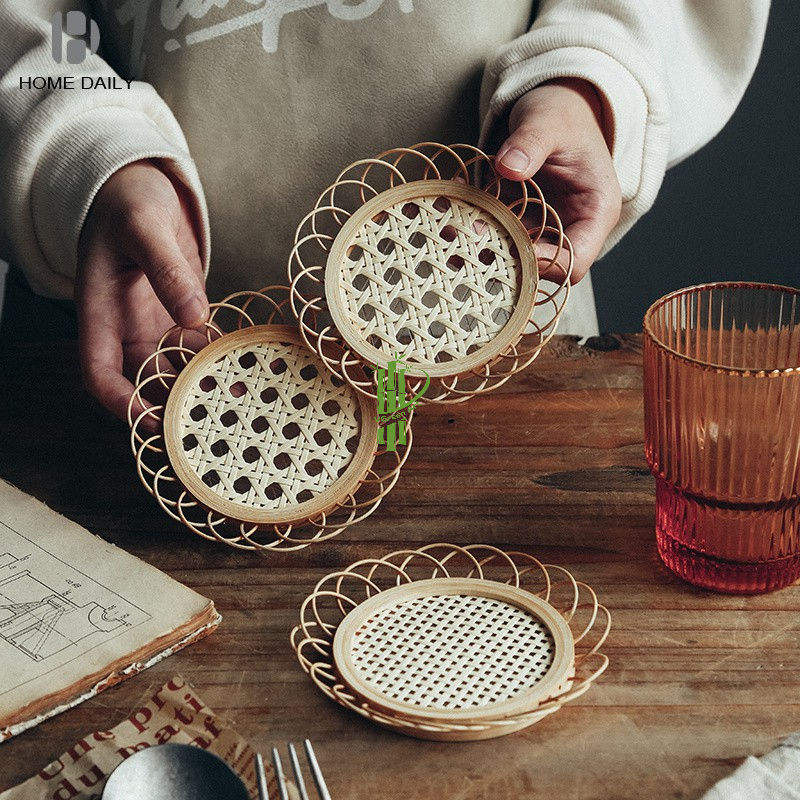 แผ่นรองแก้วไม้ไผ่ทอมือพร้อมกรอบโลหะสีทอง อุปกรณ์ตกแต่งโต๊ะอาหารที่เป็นมิตรกับสิ่งแวดล้อมสำหรับโรงแรม ร้านกาแฟ และการตกแต่งบ้าน