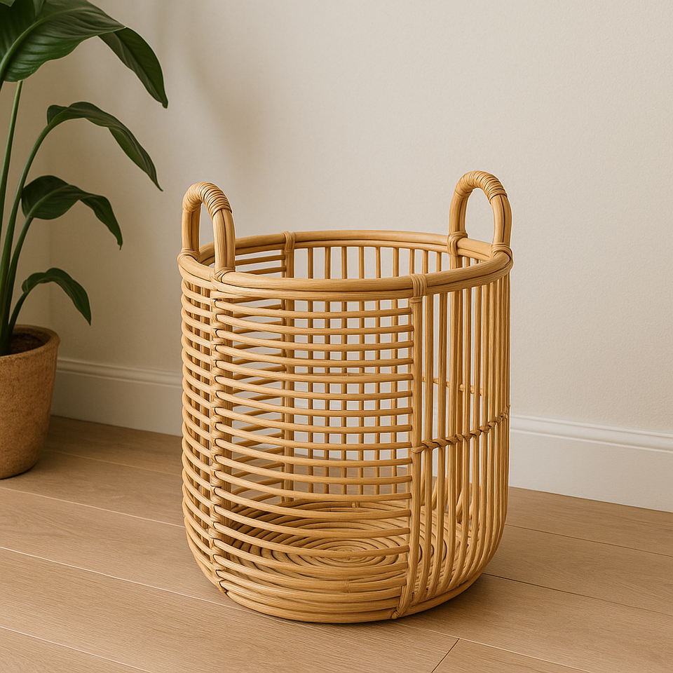 ตะกร้าหวายสานด้วยมือทรงกลมพร้อมที่จับทนทานและอเนกประสงค์ตกแต่งบ้านสำหรับการจัดเก็บรองเท้าซักรีด