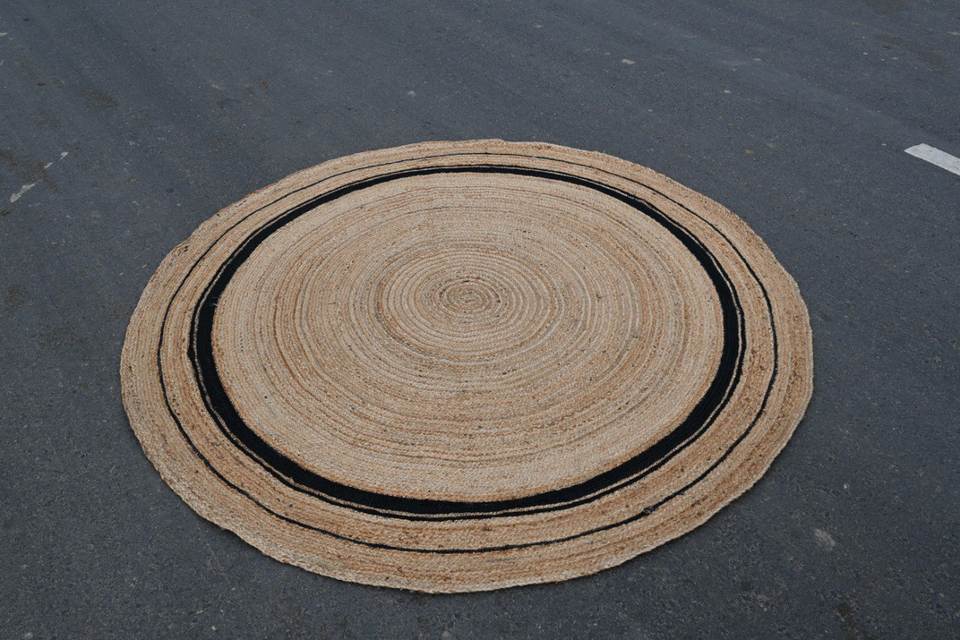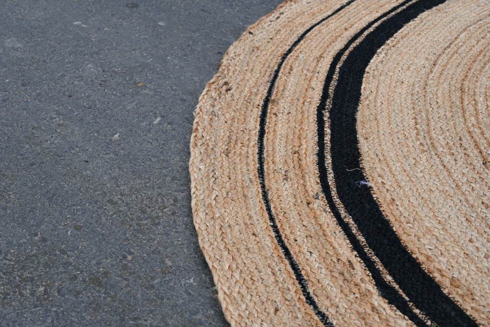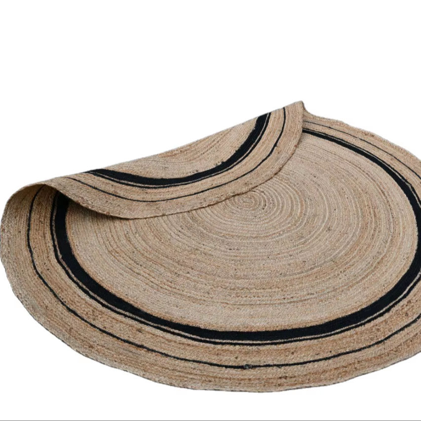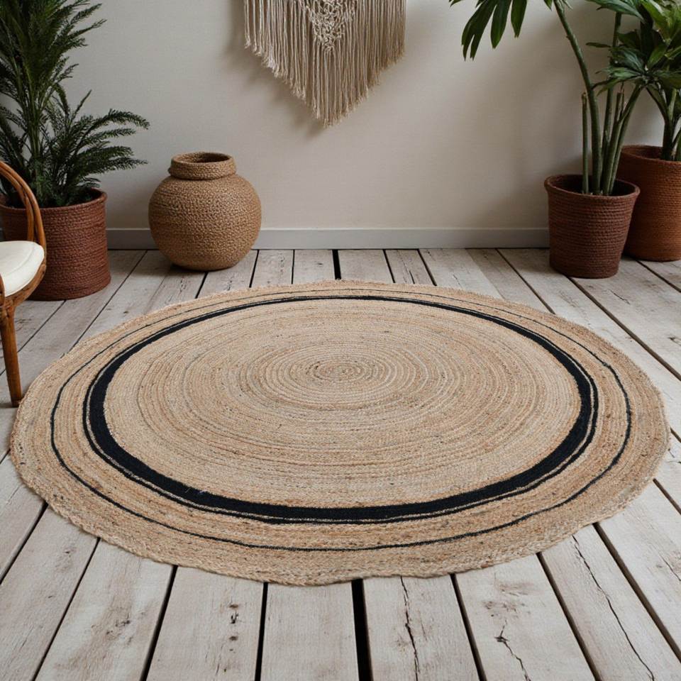 พรมปูพื้นทรงกลมทำจากปอกระเจาธรรมชาติถักทอด้วยมือ พร้อมขอบสีดำลายวงแหวน – พรมปูพื้นรักษ์โลก ขนาดสั่งทำได้ พรมปูพื้นทรงกลมถักจากปอกระเจา