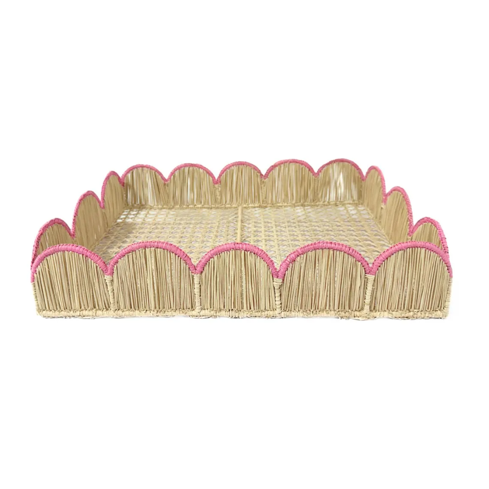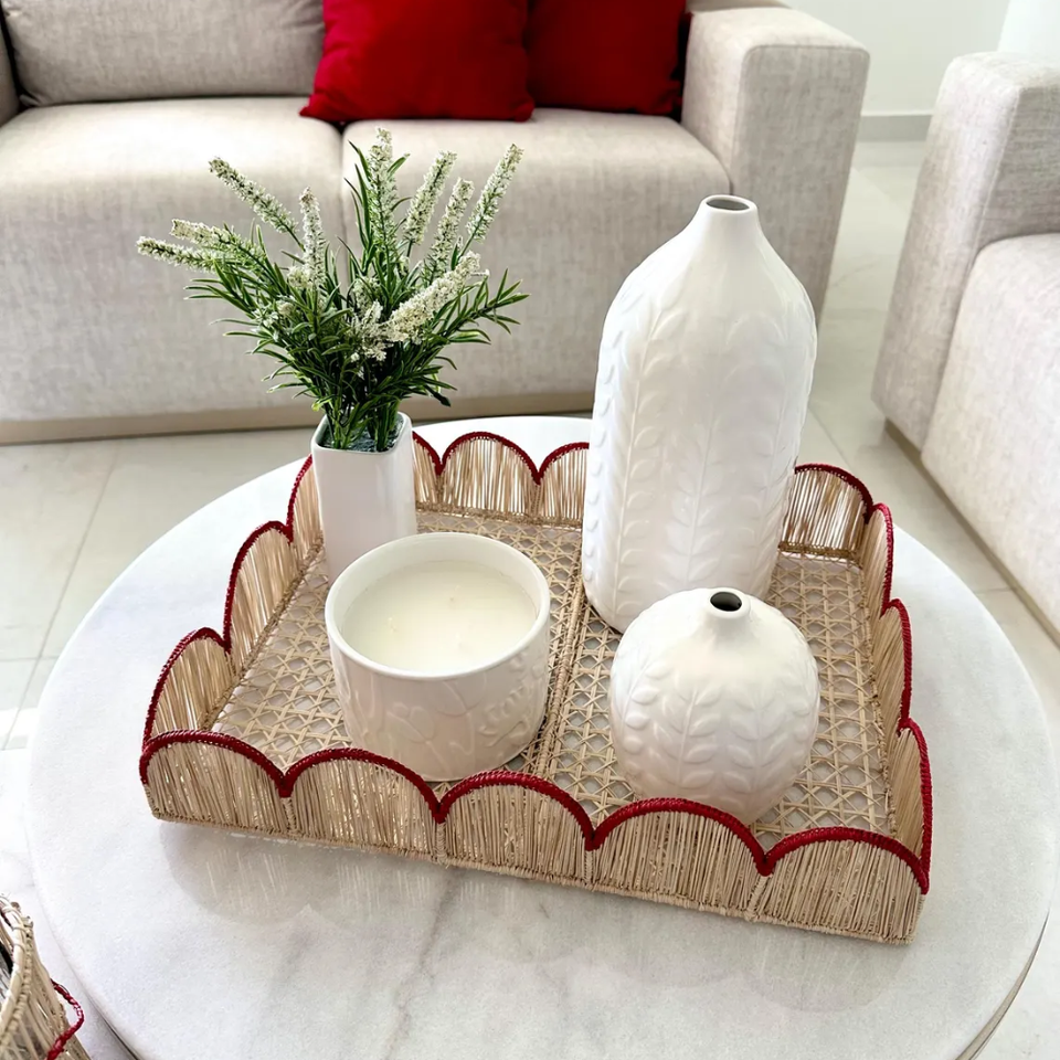 ถาดตกแต่งหวายสานมือขอบหยักสีแดง / ที่จัดระเบียบโต๊ะหวายสุดหรูสำหรับตกแต่งบ้าน