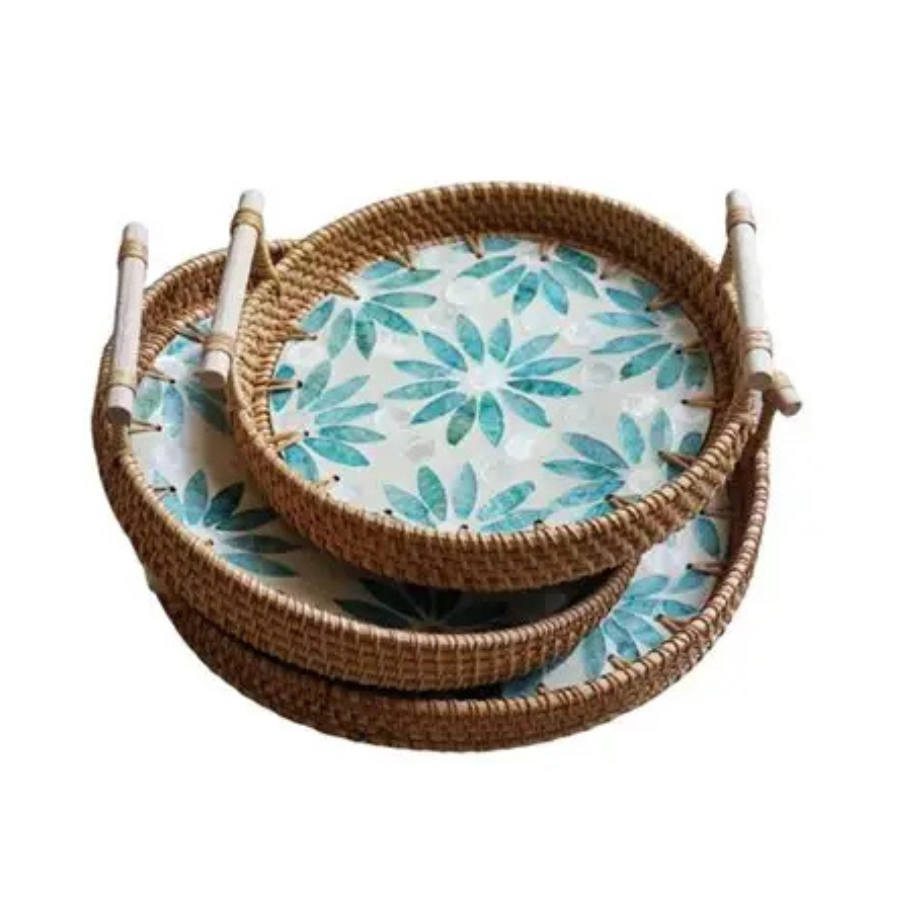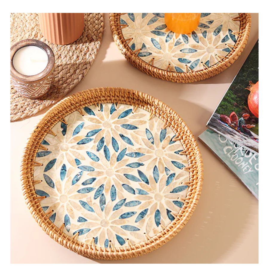 ถาดหวายทอมือพร้อมฝังมุกสำหรับตกแต่งบ้านหรูหราและบริการที่ใช้งานได้