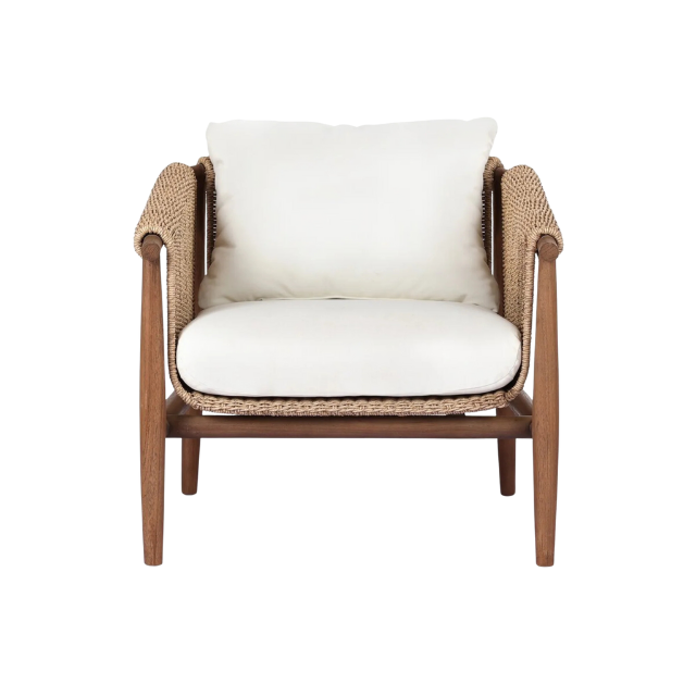 เก้าอี้พักผ่อนกลางแจ้งทันสมัยแบบเชือกถักมือ พร้อมโครงไม้สักแท้และเบาะรองนั่งและพนักพิงหนา สำหรับใช้ในโรงแรม