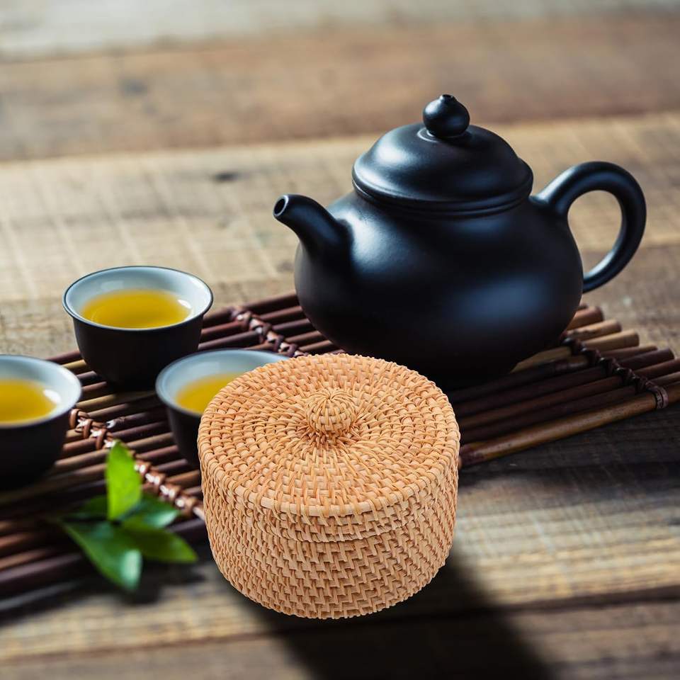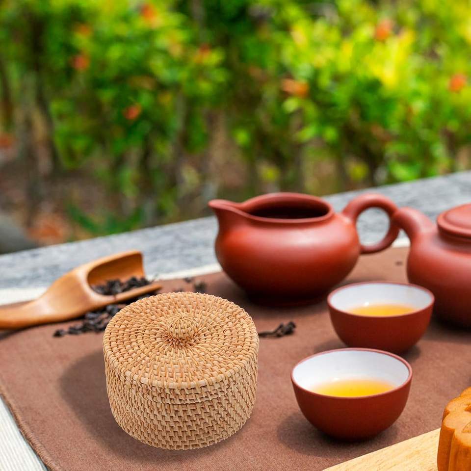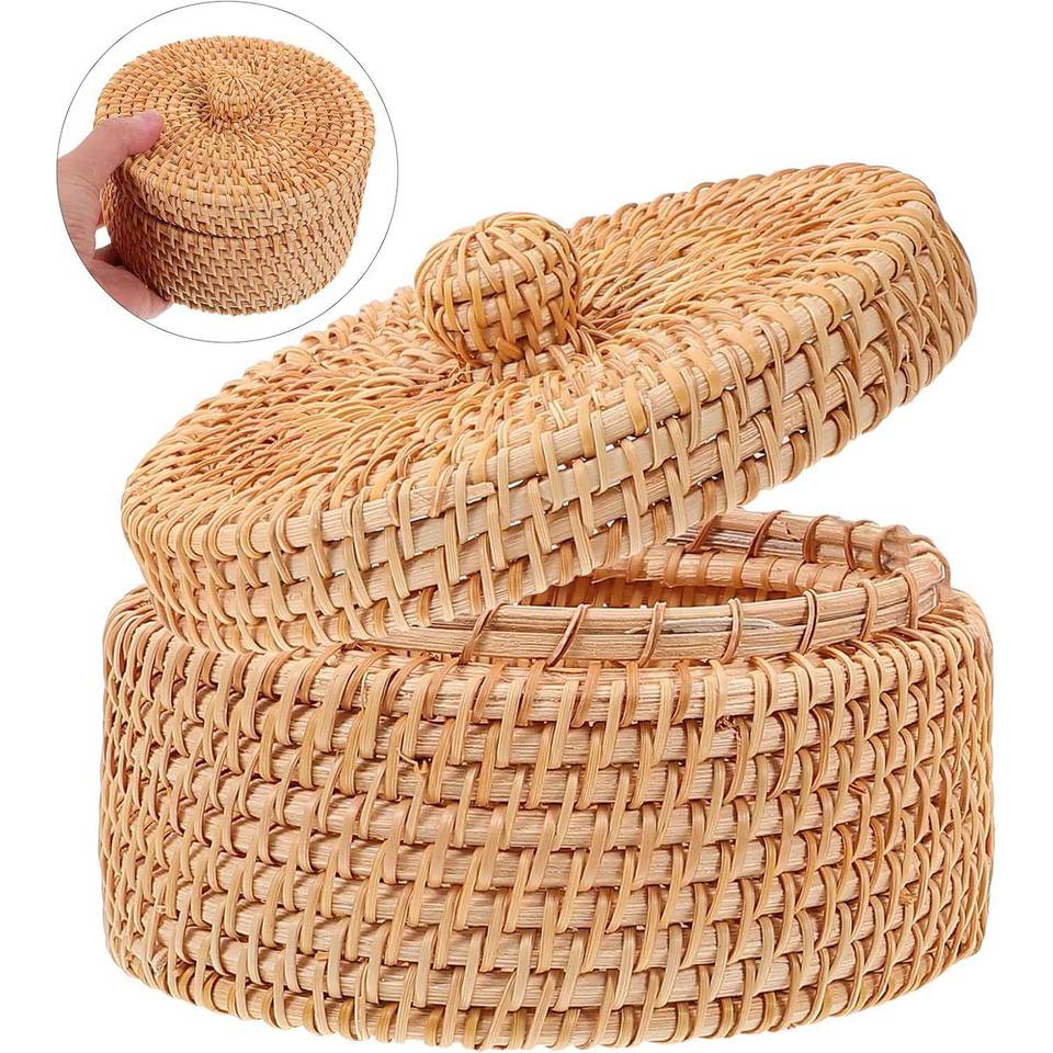 ตะกร้าหวายสานมือทรงกลมพร้อมฝาปิด ขนาดกะทัดรัดสำหรับจัดเก็บเครื่องสำอาง ขนม ถุงชา ของตกแต่งบนเคาน์เตอร์