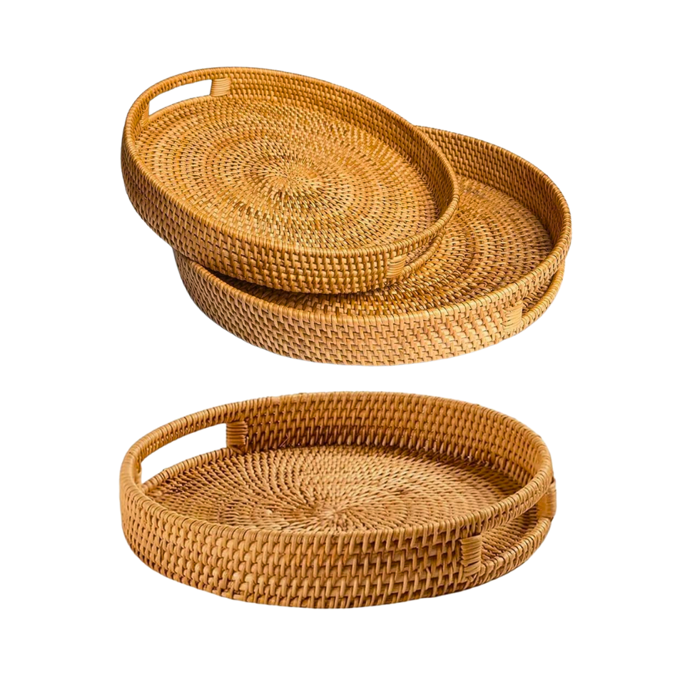 ตะกร้าหวายสานด้วยมือทรงกลม/ถาดตะกร้าหวายธรรมชาติสำหรับห้องครัวและรับประทานอาหารแบบชนบท