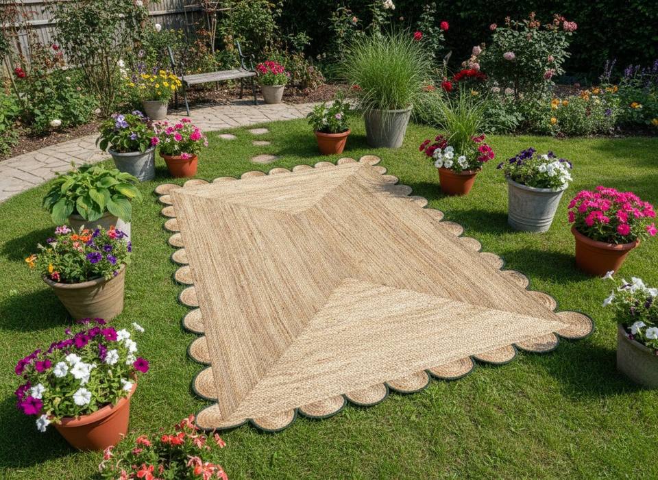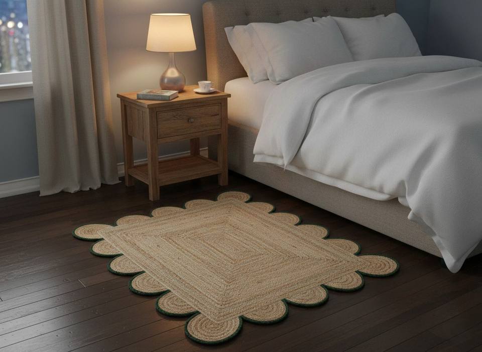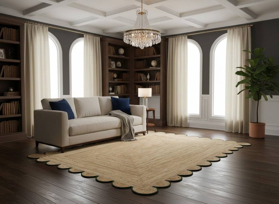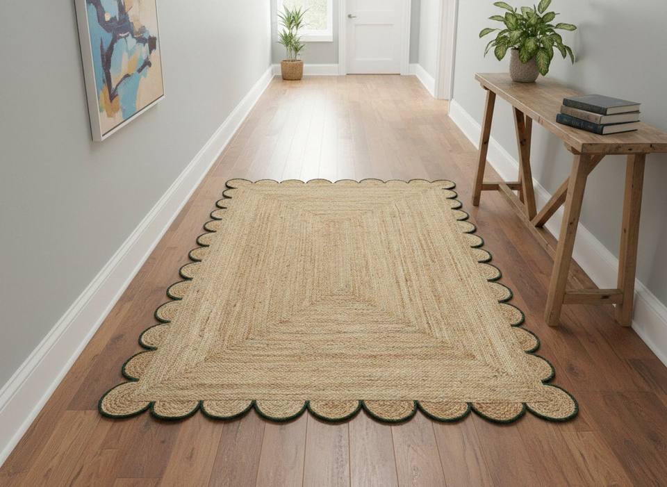 Handwoven Scalloped Edge Natural Jute Eco-Friendly Washable Modern Area Rug Customizable Sizes Dorm & Home Use