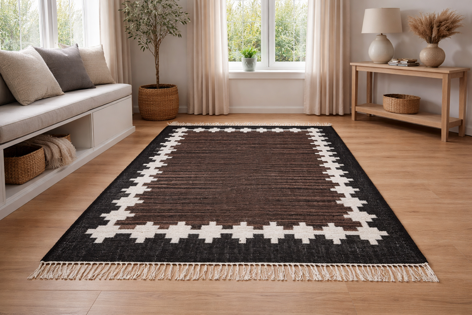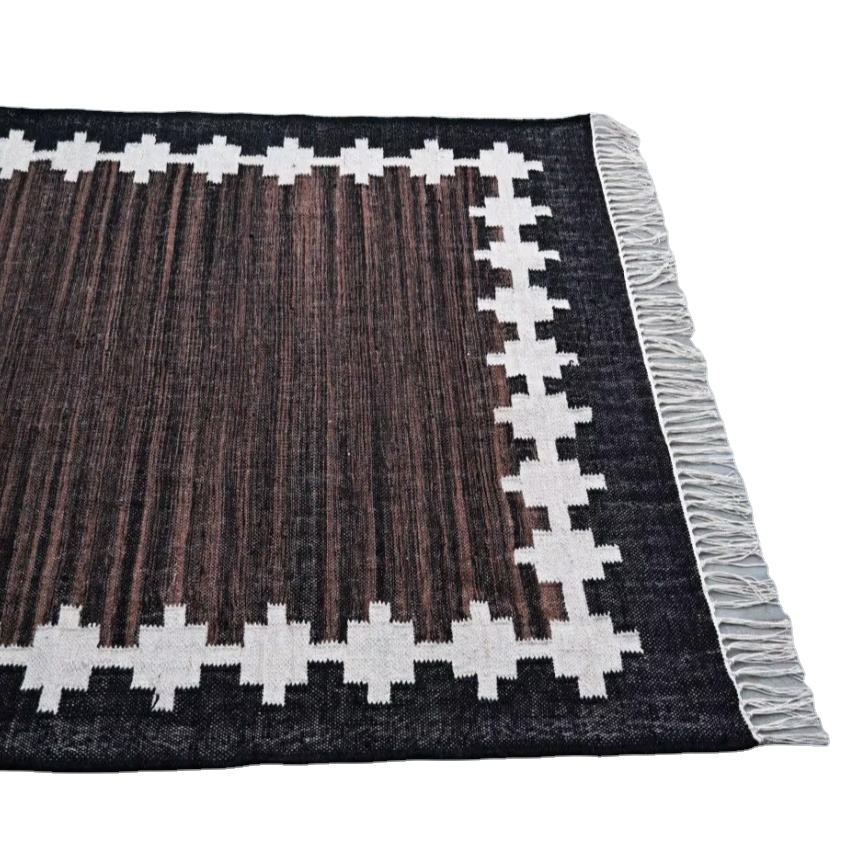 พรมทอมือจากขนสัตว์และผ้าฝ้าย ซักได้ ทำด้วยมือ สีดำน้ำตาล ลายเรขาคณิต ขอบแบบแบน ใช้กลับด้านได้ เหมาะสำหรับใช้ในบ้าน