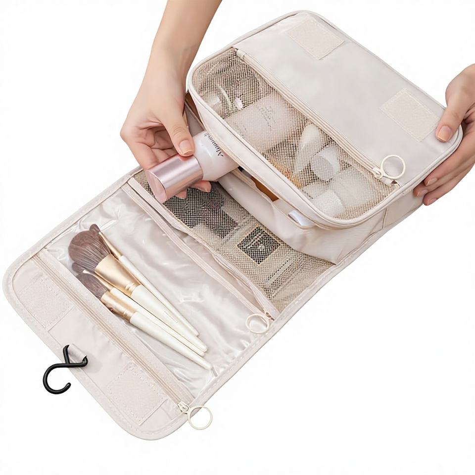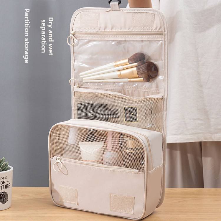 กระเป๋าเครื่องสำอางแบบแขวนสไตล์เกาหลี ซิป กระเป๋าเดินทางความจุขนาดใหญ่ ผ้าทวิลล์ พร้อมหูหิ้ว พกพาสะดวก กันน้ำ แยกส่วนเปียก-แห้ง