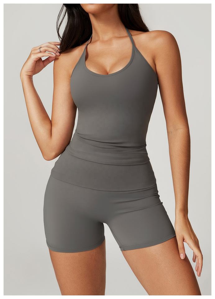 ชุดโยคะสายคล้องคอแบบแน่นด้านหลังแห้งเร็วชุดกีฬาฟิตเนสเอวสูงแบบพับได้สำหรับสันทนาการร้อย
