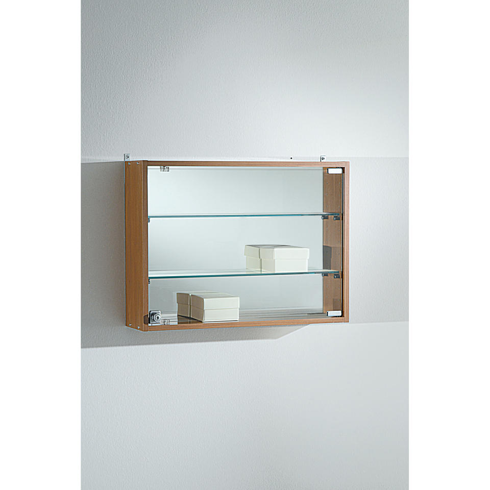 Hanging Wall Display Cabinet 60x45cm Cherry Wood Glass Shelves Mirror Back Lockable Door