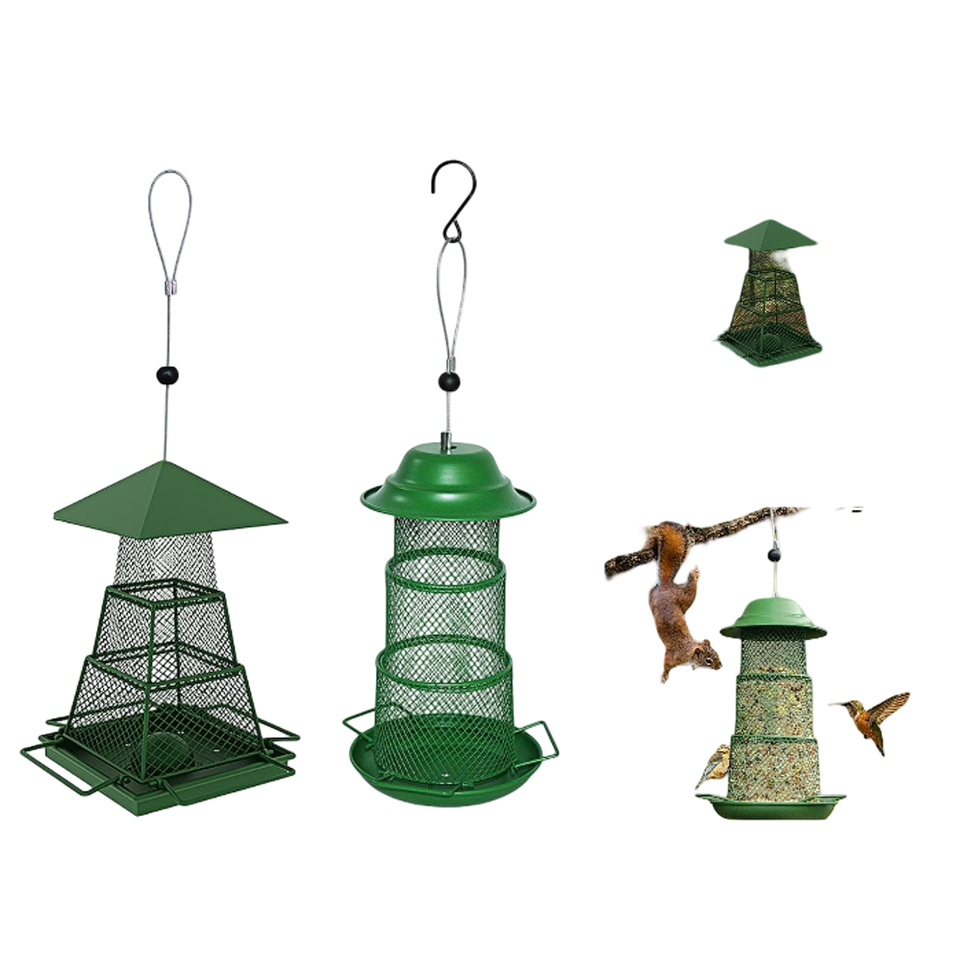 เครื่องป้อนเมล็ดนกป่าแบบแขวนที่บ้านนกโลหะเคลือบด้วยผงสีแดงและสีเขียวแบบสำเร็จรูป