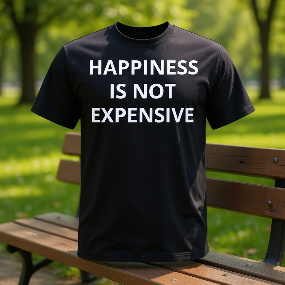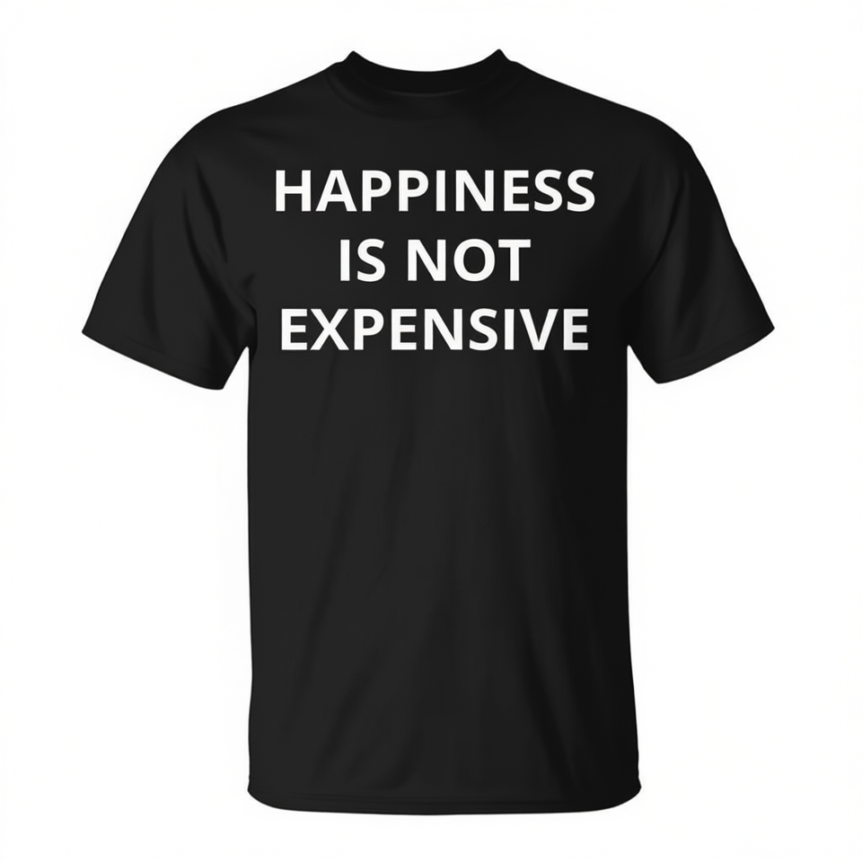 ความสุขไม่ได้มีราคาแพง คำว่า "Happiness Is Not Expensive" บนเสื้อยืด เสื้อยืดโปรโมชั่น