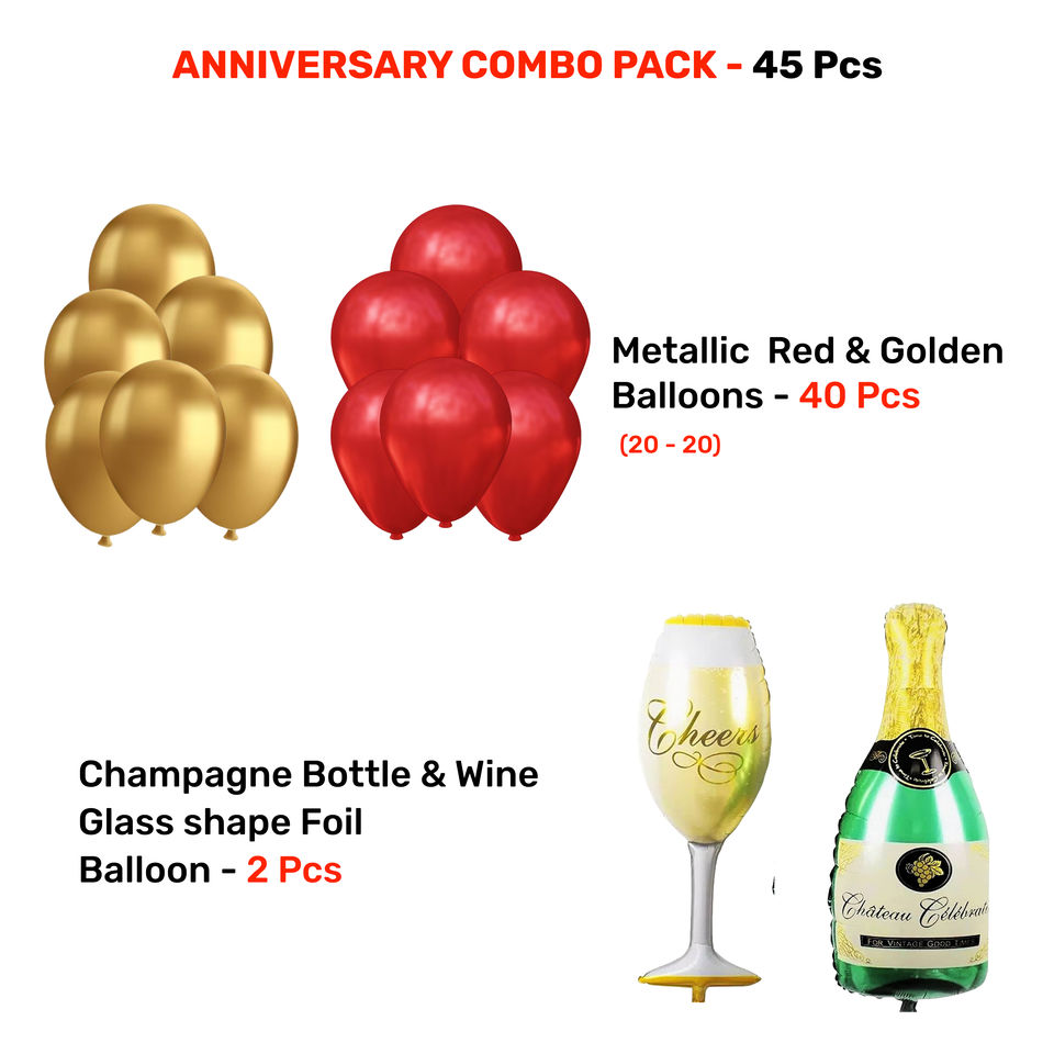 ชุดคอมโบพรีเมียมสีแดงฉลองครบรอบ | ลูกโป่งสีแดงทองเมทัลลิก 45 ชิ้น | ลูกโป่งฟอยล์รูปขวดแชมเปญและแก้วไวน์