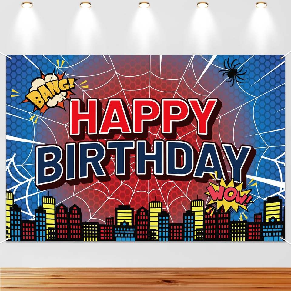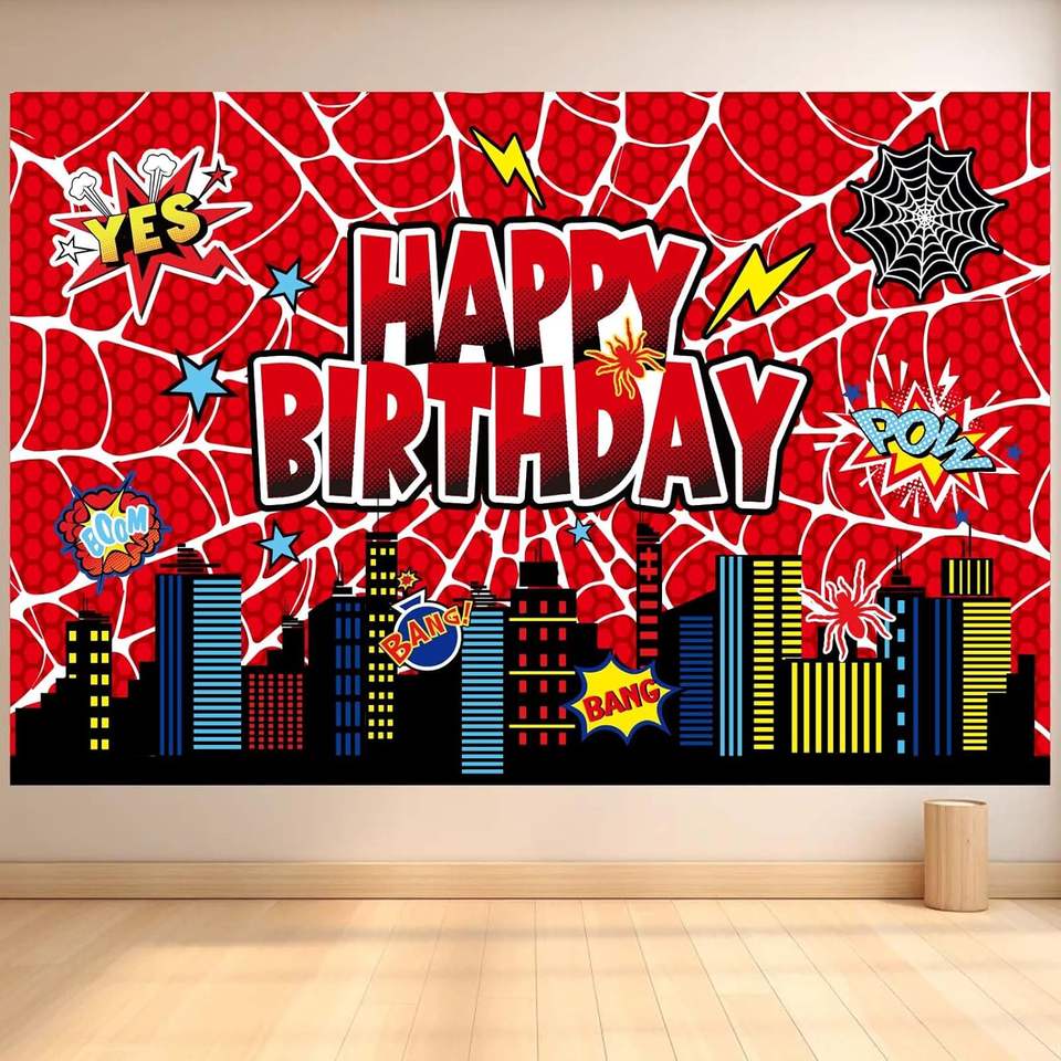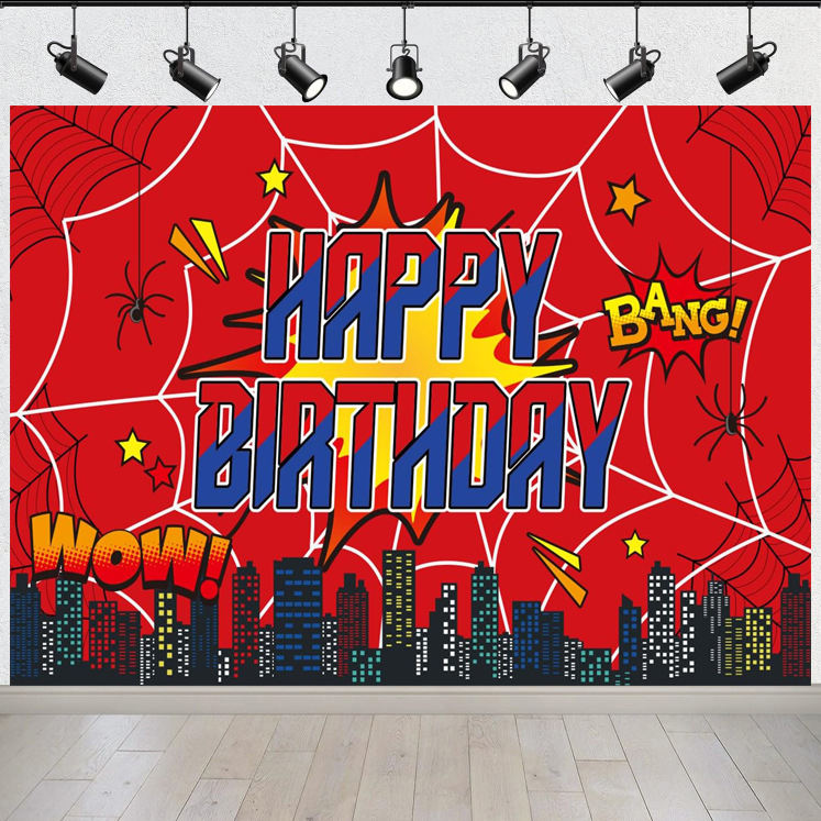 สุขสันต์วันเกิดฉากหลังคอมมิคซิตี้ใยแมงมุมการถ่ายภาพพื้นหลังเด็กชายธีมซูเปอร์ฮีโร่ตกแต่งปาร์ตี้แบนเนอร์ปรับแต่งได้