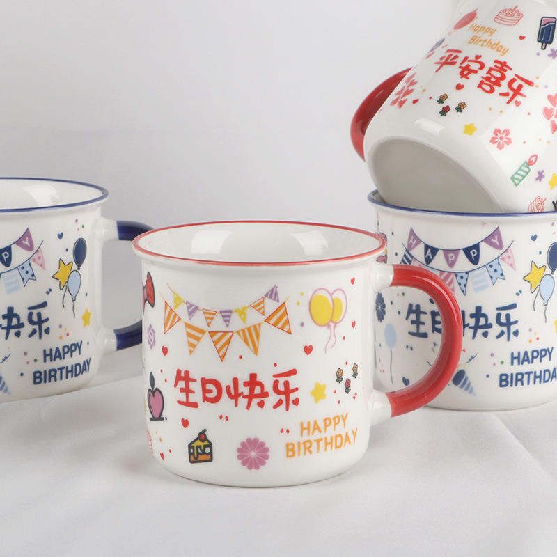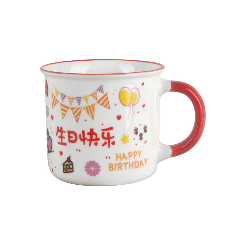 แก้วเซรามิกลายการ์ตูนสุขสันต์วันเกิด พร้อมหูจับสีแดง ของขวัญสำหรับเด็กและผู้ใหญ่