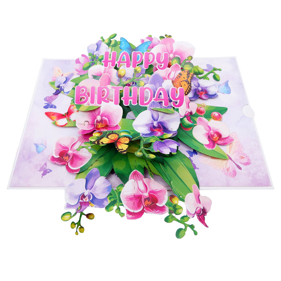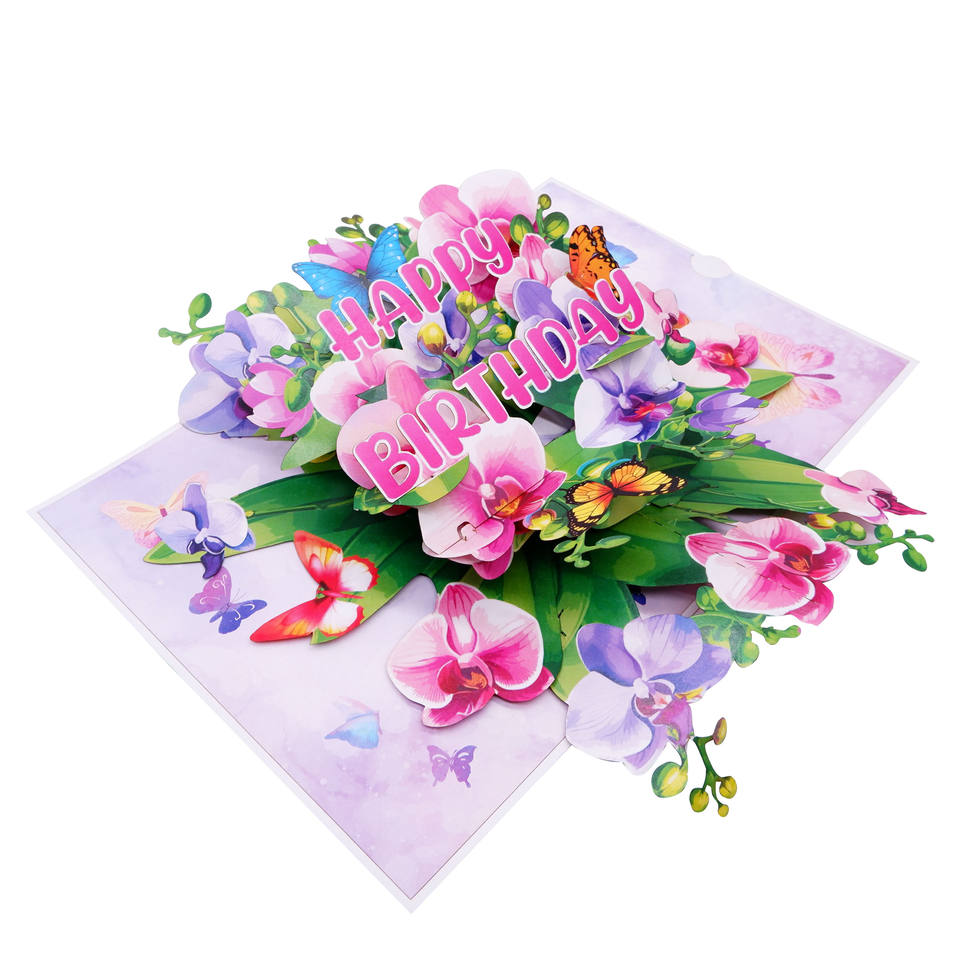การ์ดอวยพรวันเกิดแบบป๊อปอัพ 3 มิติ ลายกล้วยไม้ ผลิตจากกระดาษรีไซเคิล เป็นมิตรกับสิ่งแวดล้อม เคลือบเงาอย่างดี พร้อมซอง สำหรับงานเฉลิมฉลอง