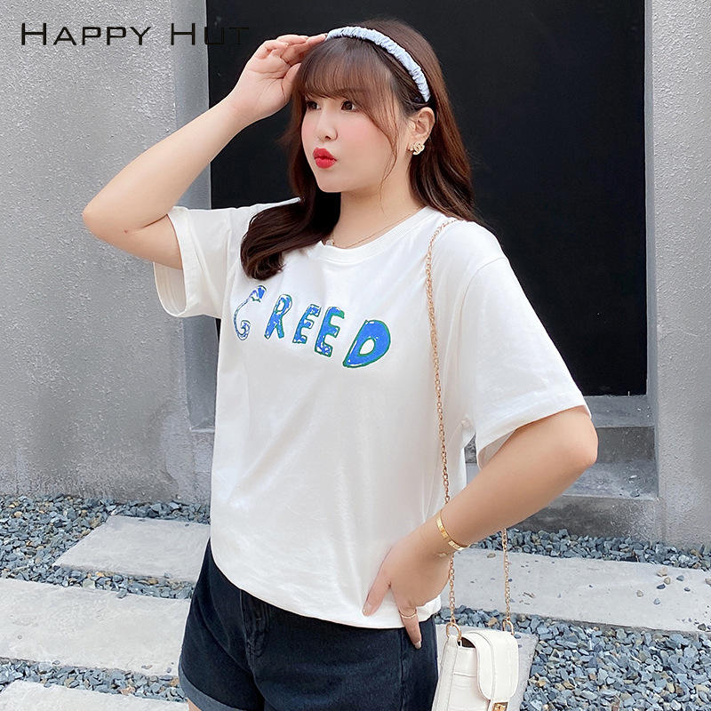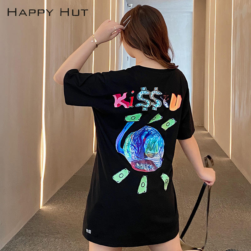 Happy Hut เดรสลำลองสำหรับผู้หญิง, เดรสคอกลมระบายอากาศได้ดีพิมพ์ลายไซส์ใหญ่ TN7558สวมใส่ได้ทุกวัน