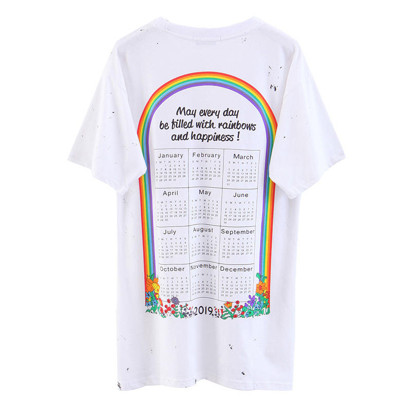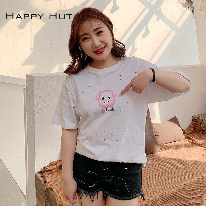 แฮปปี้ฮัทเสื้อยืดผู้หญิงไซส์ใหญ่สีขาวแขนสั้นพิมพ์ลายหมึกสาด 2019 ดีไซน์ปฏิทิน N6659