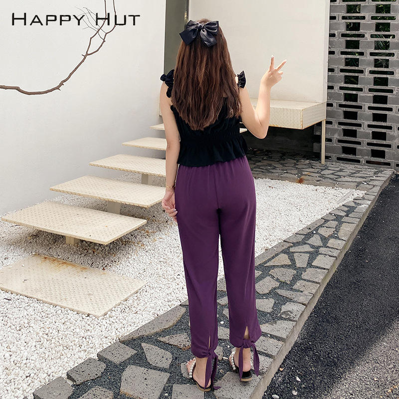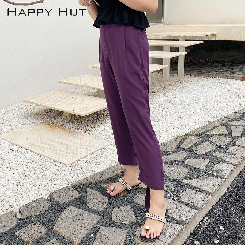 กางเกงผ้าเครปสีม่วงสำหรับผู้หญิง Happy Hut พร้อมรอยผ่าและซิป ขนาดพลัสไซส์ กางเกงขายาวเก้าส่วน ระบายอากาศได้ดี สำหรับผู้หญิงรูปร่างอวบ