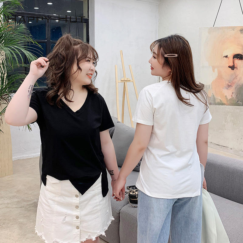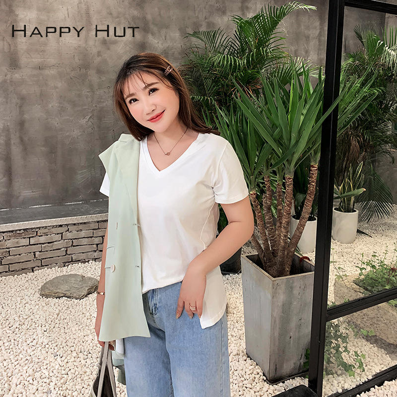 แฮปปี้ฮัทเสื้อยืดคอวีแขนสั้นผู้หญิง ผ้าเจอร์ซีย์ระบายอากาศได้ดี พลัสไซส์ เสื้อฤดูร้อน ดีไซน์ไม่สมมาตร N6174