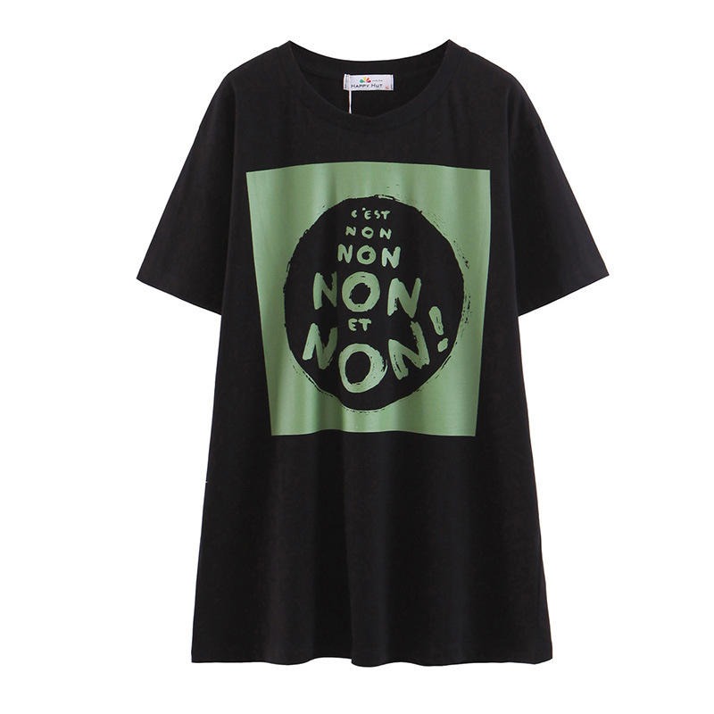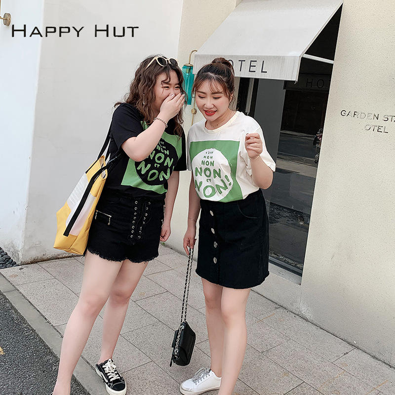 แฮปปี้ฮัทเสื้อยืดแขนสั้นผู้หญิง N6985 ผ้าเจอร์ซีย์พิมพ์ลายฤดูร้อนสไตล์บางสีขาวและสีดำขนาดพลัสไซส์สำหรับผู้หญิง