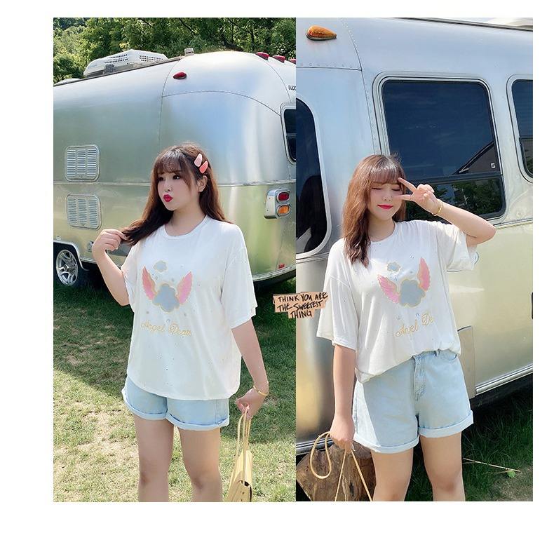 Happy Hut เสื้อยืดแขนสั้นของผู้หญิง, เสื้อถักสีขาวส้มระบายอากาศไซส์ใหญ่พิเศษเสื้อ N7648ฤดูร้อน